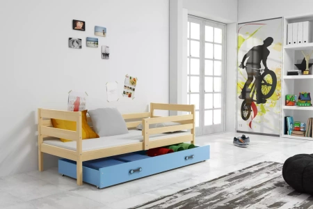 ERYK jednolôžková posteľ pre dospievajúcich 90X190 s matracom a zásuvkou, borovicová/modrá