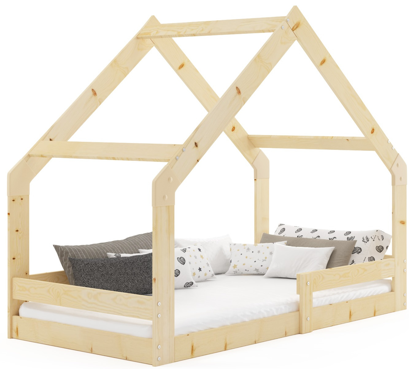 Bezpečnostné zábradlie zaisťuje bezpečnosť a drevený rám podporuje zdravý vývoj chrbtice. Veľkosť 80x160 cm je vhodná pre deti vo veku od 3 do 10 rokov. Posteľ Cottage z prírodného dreva spája estetiku, pohodlie a funkčnosť a stáva sa jedinečnou dekoráciou detskej izby.