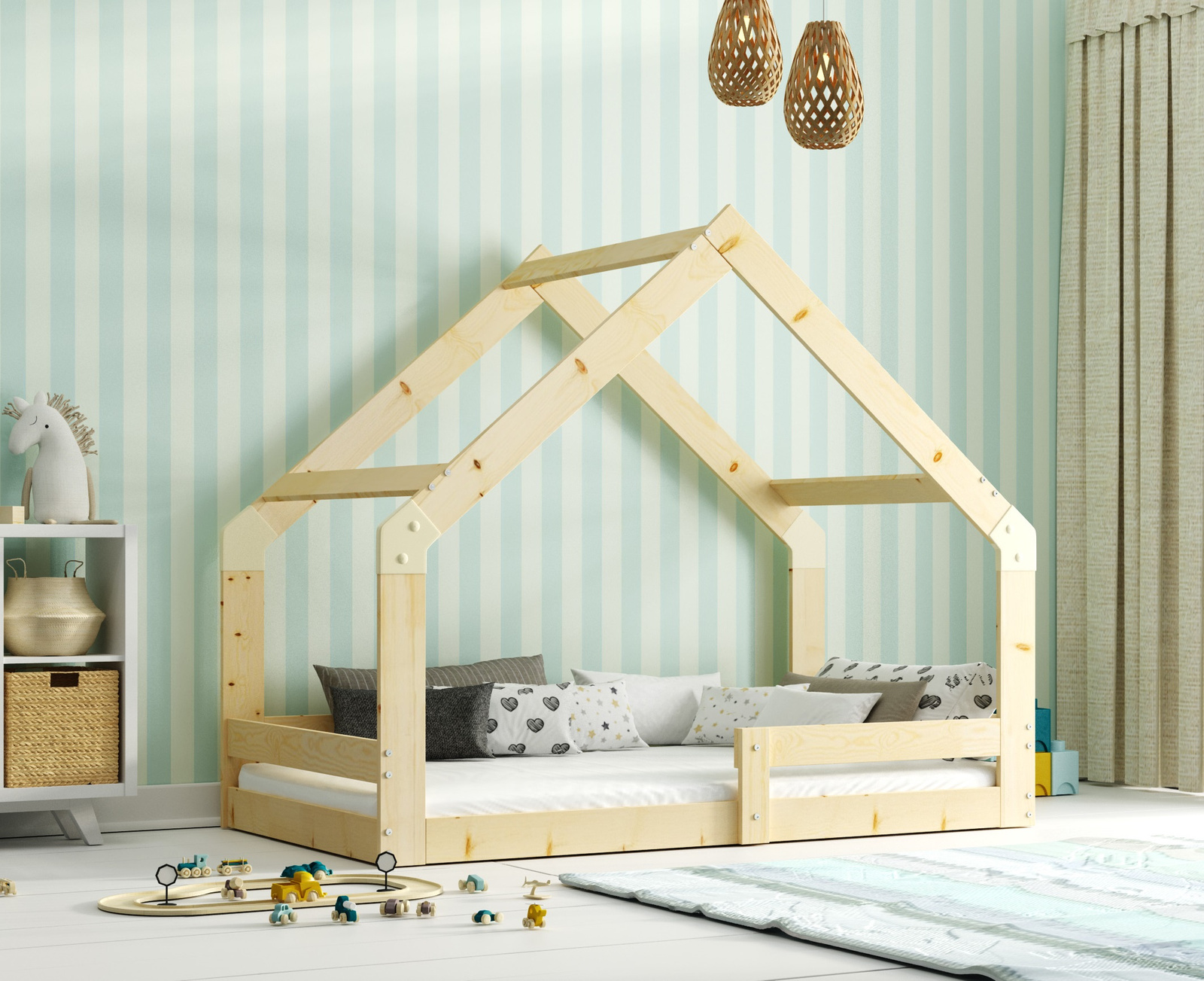 Posteľ Cottage je ideálnym riešením pre batoľatá, ktoré potrebujú svoj priestor. Dizajn v tvare domčeka dodáva interiéru teplú a rozprávkovú atmosféru, ktorá podporuje spánok a hry. Robustný rám z prírodného dreva vydrží zaťaženie až do 100 kg, čo zaručuje stabilitu a odolnosť na dlhé roky.