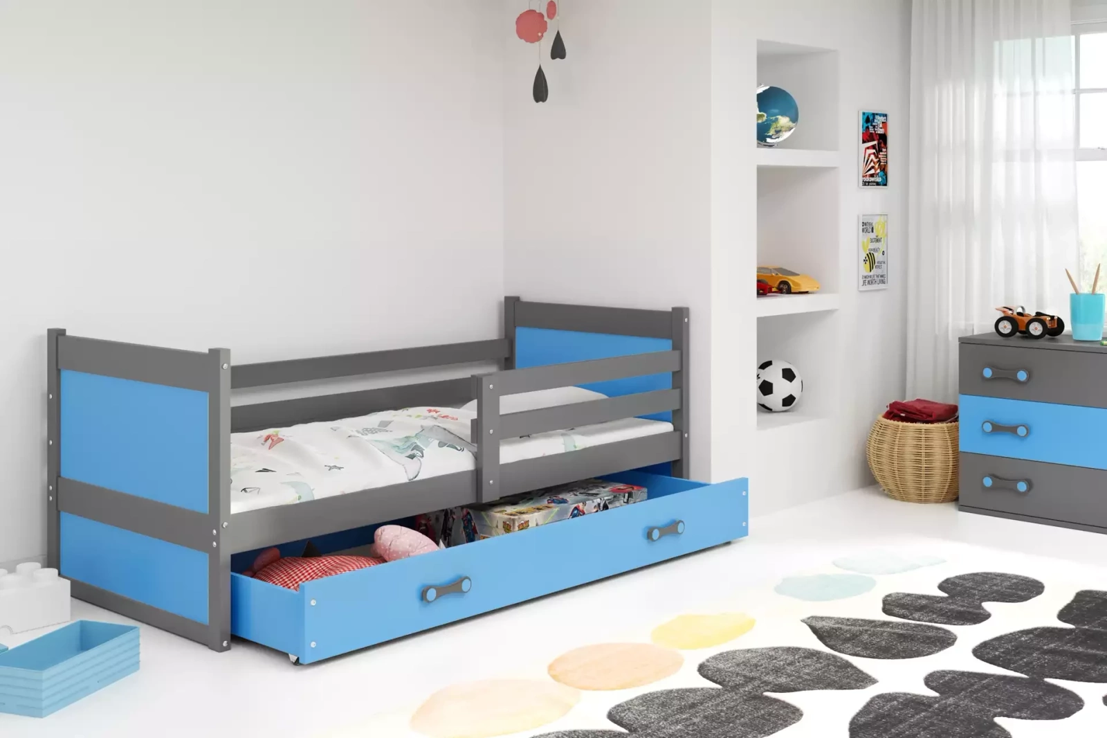 Zobrazená jednotka má veľkú zásuvku. Je ideálny na uskladnenie všetkých druhov vecí, napríklad oblečenia alebo posteľnej bielizne. Zásuvka je vybavená kolieskami, vďaka ktorým sa dá ľahko a prakticky vybrať. Všimnite si starostlivo vypracované rukoväte, ktoré robia celú vec ešte atraktívnejšou. Modrá zásuvka v spodnej časti poteší všetkých chlapcov. Môže sa použiť ako miesto na lôžkoviny alebo ako ďalší úložný priestor na hračky. Praktické riešenie, ktoré si obľúbite predovšetkým vtedy, ak máte radi poriadok. Do tejto postieľky si môžete zakúpiť matrac s klimatizačným vláknom. Samotný poťah je vyrobený z hypoalergénnej tkaniny, takže je vhodným riešením pre deti trpiace alergiami.