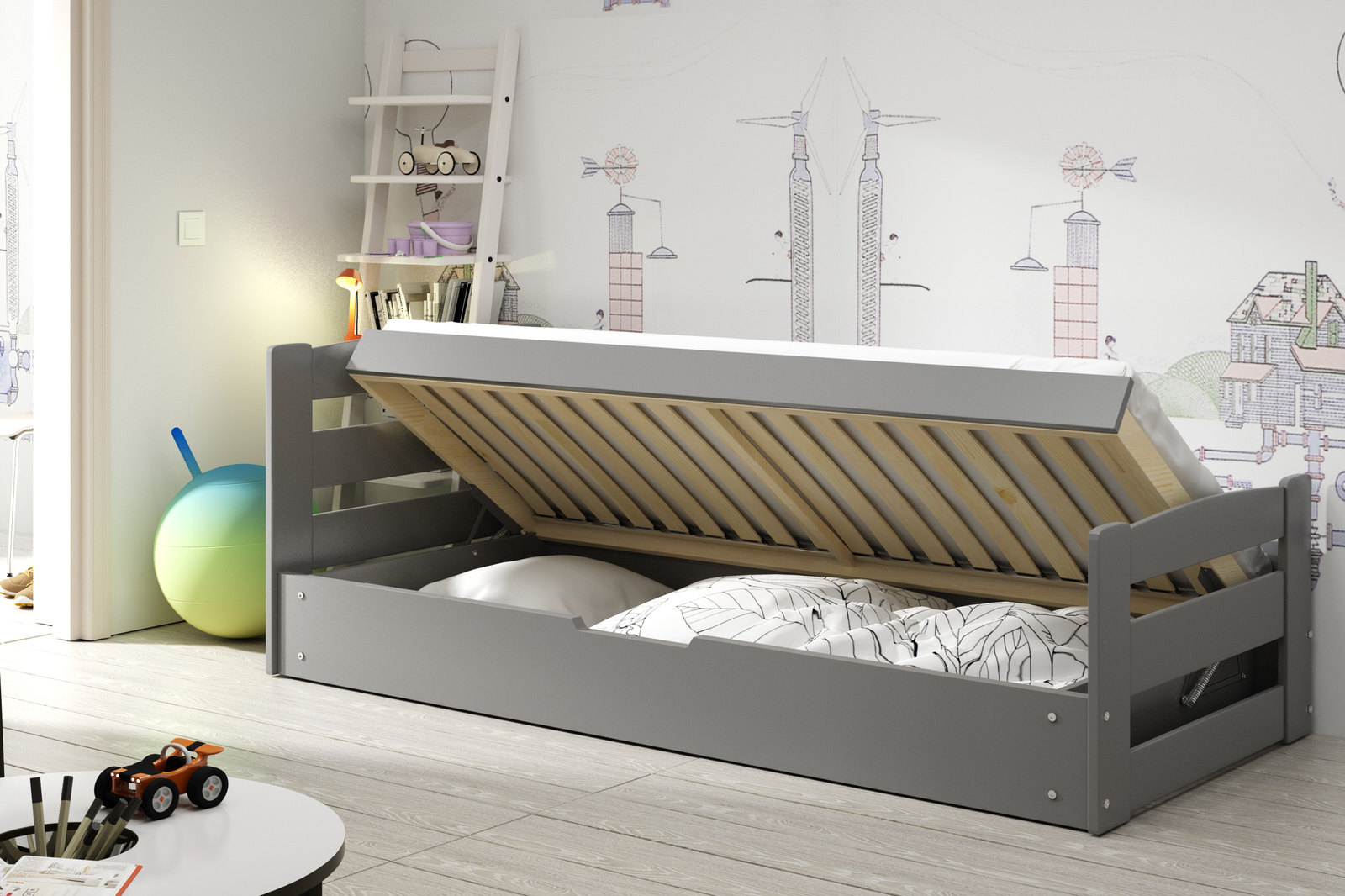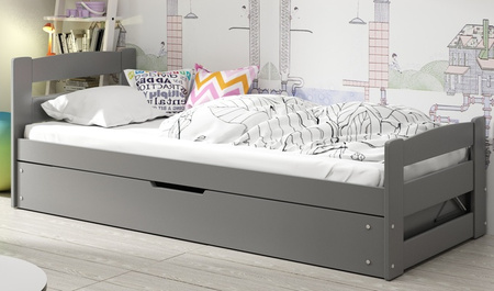 Jednolôžková posteľ Erni je určená do každej detskej izby. Borovicová konštrukcia je odolná a vystužená oceľovými skrutkami na zvýšenie pevnosti, vďaka čomu je posteľ pripravená na zaťaženie až do 100 kg. Odpružený rám z brezových dosiek zaručuje pohodlný spánok a poskytuje správnu oporu chrbtici. Pod pružinovým zdvíhacím rámom sa nachádza kontajner na posteľnú bielizeň, ktorý uľahčuje udržiavanie poriadku v miestnosti. Grafitová farba bola získaná natretím povrchu dreva úplne bezpečnou a antialergickou farbou, vďaka čomu je výrobok bezpečný aj pre deti s citlivou pokožkou. Posteľ Erni je pohodlným riešením, ktoré bude vynikajúcou investíciou na dlhé roky. Vďaka svojej veľkosti je model 90x200 ideálny pre tínedžerov. Na druhej strane, keď sa kúpi pre batoľa, bude mu slúžiť mnoho rokov.