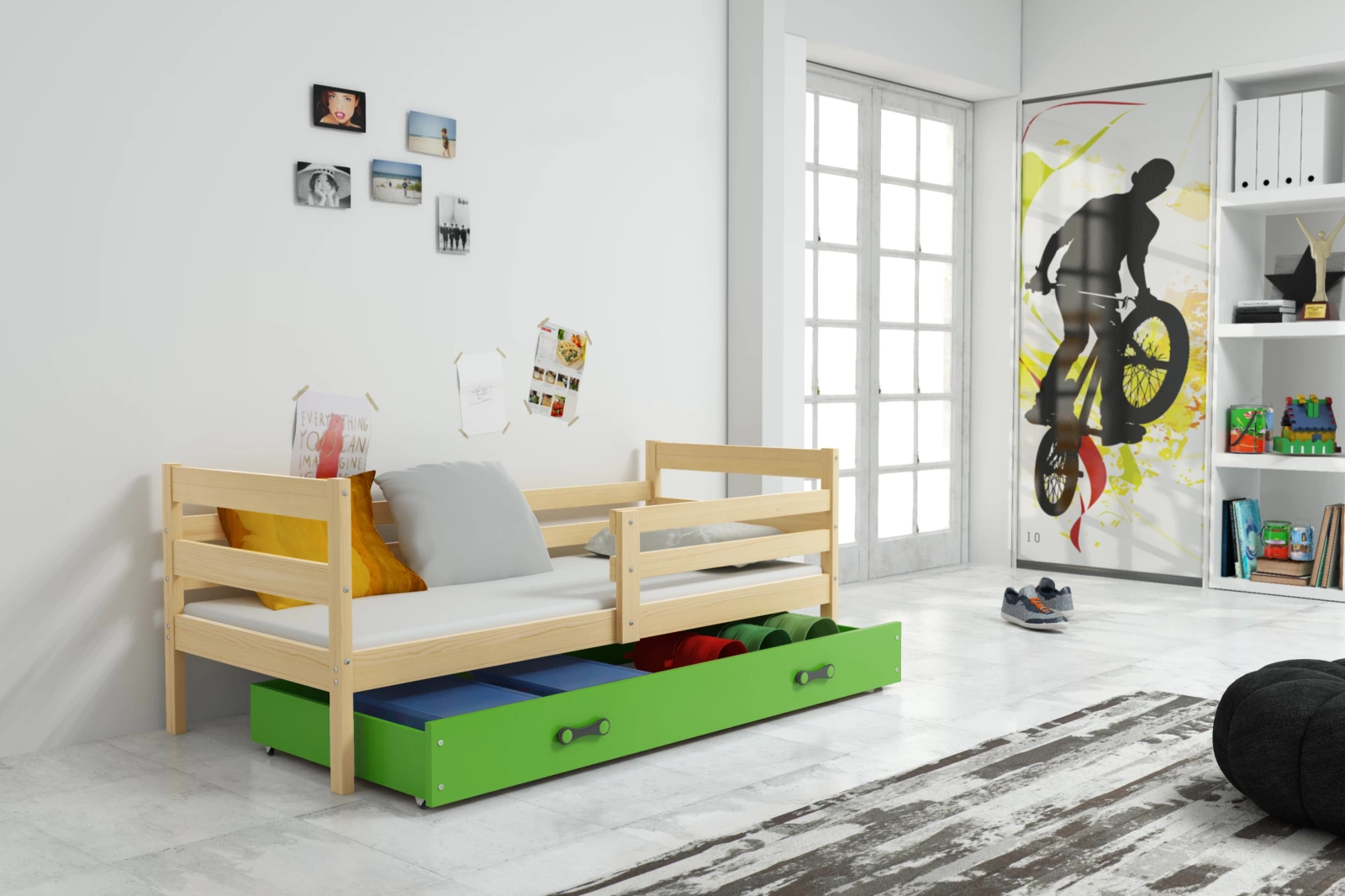Jednolôžková posteľ pre mladých ERYK 80X190 s matracom a zásuvkou, borovicová/zelená