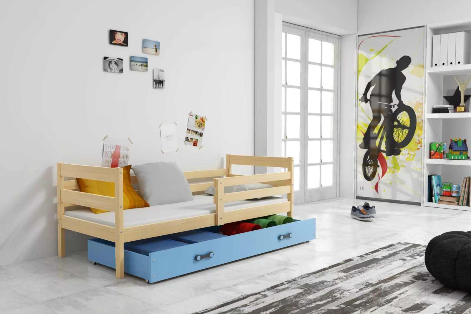 Jednolôžková posteľ pre mladých ERYK 90X200 s matracom a zásuvkou, borovicová/modrá