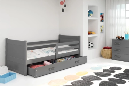 Detská posteľ RICO je vysoko funkčné riešenie pre chlapčenské aj dievčenské spálne. Vďaka svojmu minimalistickému dizajnu sa dokonale hodí k akémukoľvek interiéru. Vďaka univerzálnym farbám ho možno ľahko kombinovať s rôznymi aranžmánmi. Posteľ natretá grafitovou farbou je intenzívnym, ale neutrálnym riešením a jej konečné usporiadanie závisí od ostatných prvkov - farby stien a doplnkov. Farba pokrývajúca konštrukciu je antialergická a má všetky potrebné povolenia.