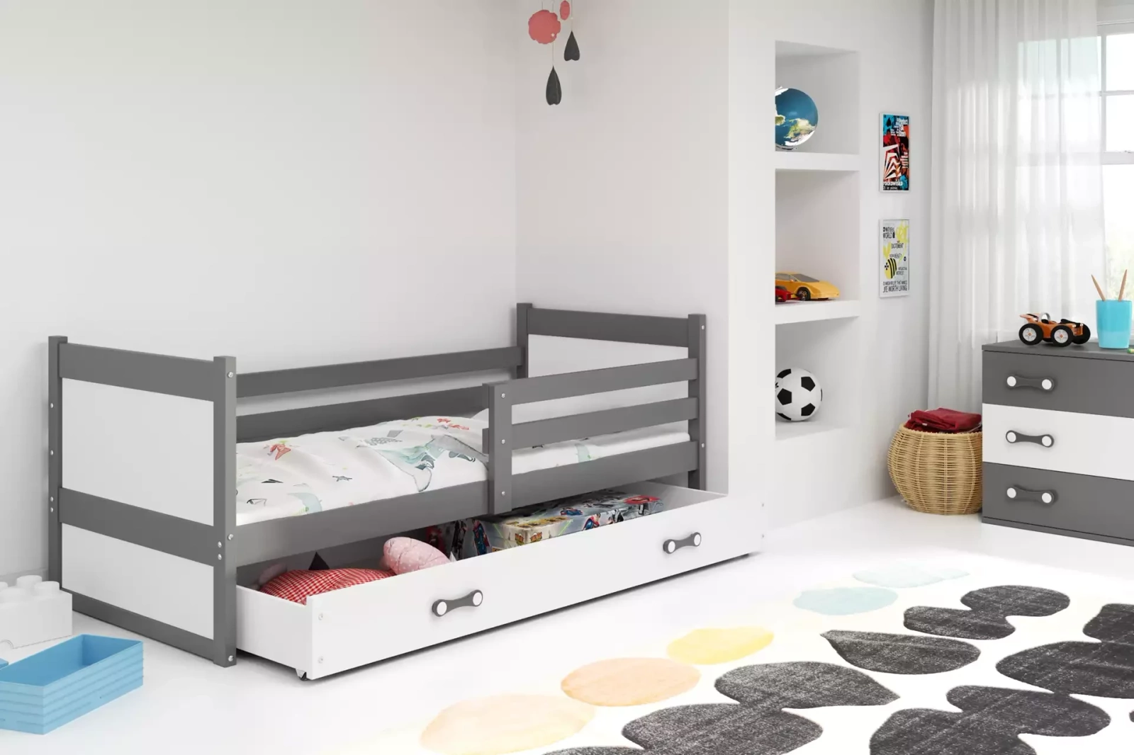 Detská posteľ RICO je vysoko funkčné riešenie pre chlapčenské aj dievčenské spálne. Vďaka svojmu minimalistickému dizajnu sa dokonale hodí k akémukoľvek interiéru. Vďaka univerzálnym farbám ho možno ľahko kombinovať s rôznymi aranžmánmi. Posteľ natretá grafitovou farbou je intenzívnym, ale neutrálnym riešením a jej konečné usporiadanie závisí od ostatných prvkov - farby stien a doplnkov. Farba pokrývajúca konštrukciu je antialergická a má všetky potrebné povolenia.
