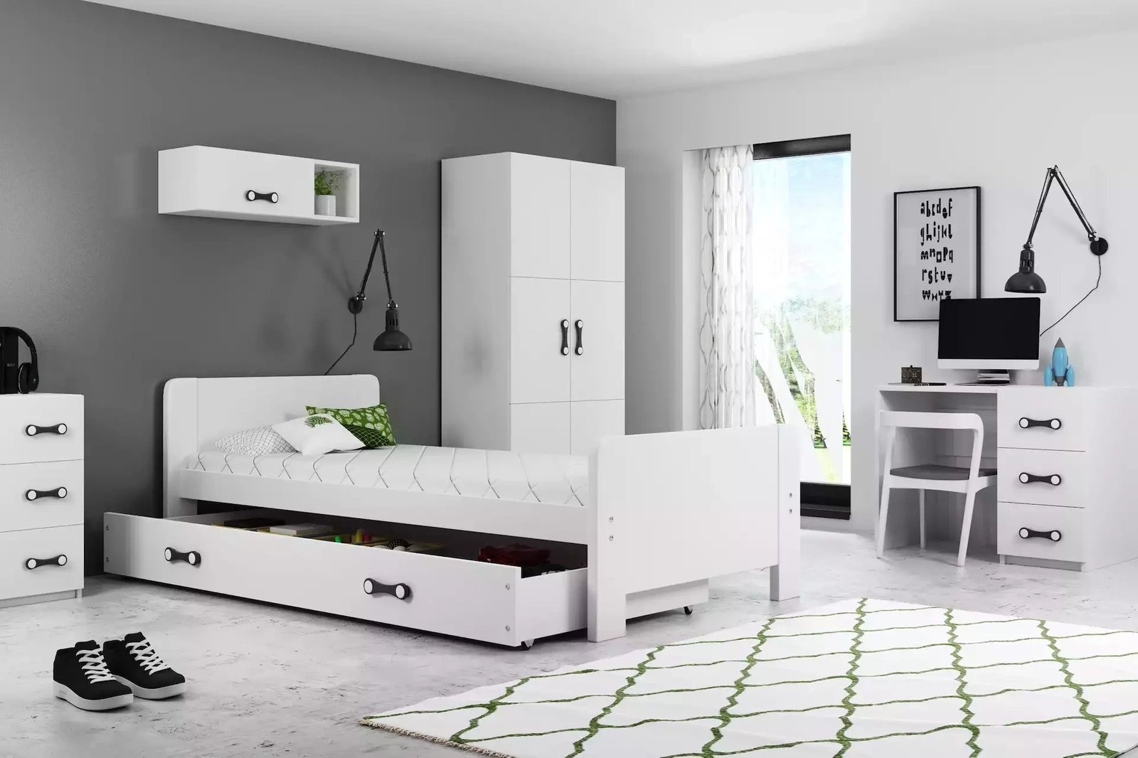 Posteľ pre mladých DAREK je vynikajúcou voľbou do izby tínedžera alebo tínedžerky. Vďaka minimalistickému dizajnu sa ľahko kombinuje s mnohými inými zariadeniami. Okrem grafitovej farby si môžete vybrať aj bielu farbu rámu. Grafitová farba rámu je univerzálna. Hodí sa k jednoduchým, minimalistickým tvarom, ktoré celému projektu dodávajú ľahkosť. Vďaka tomu posteľ napriek svojej veľkosti neprekryje interiér. Povrch dreva sme natreli antialergickou farbou, takže výrobok je bezpečný aj pre deti a dospievajúcich s citlivou pokožkou.