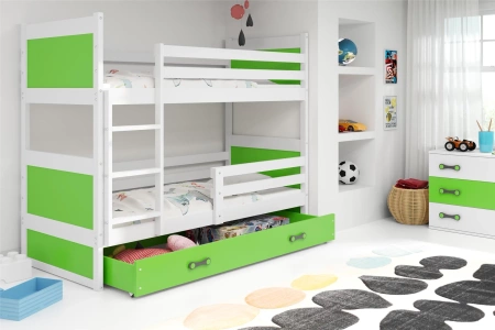Juniorská poschodová posteľ 90x190 so zásuvkou - Rico biela/zelená s matracom