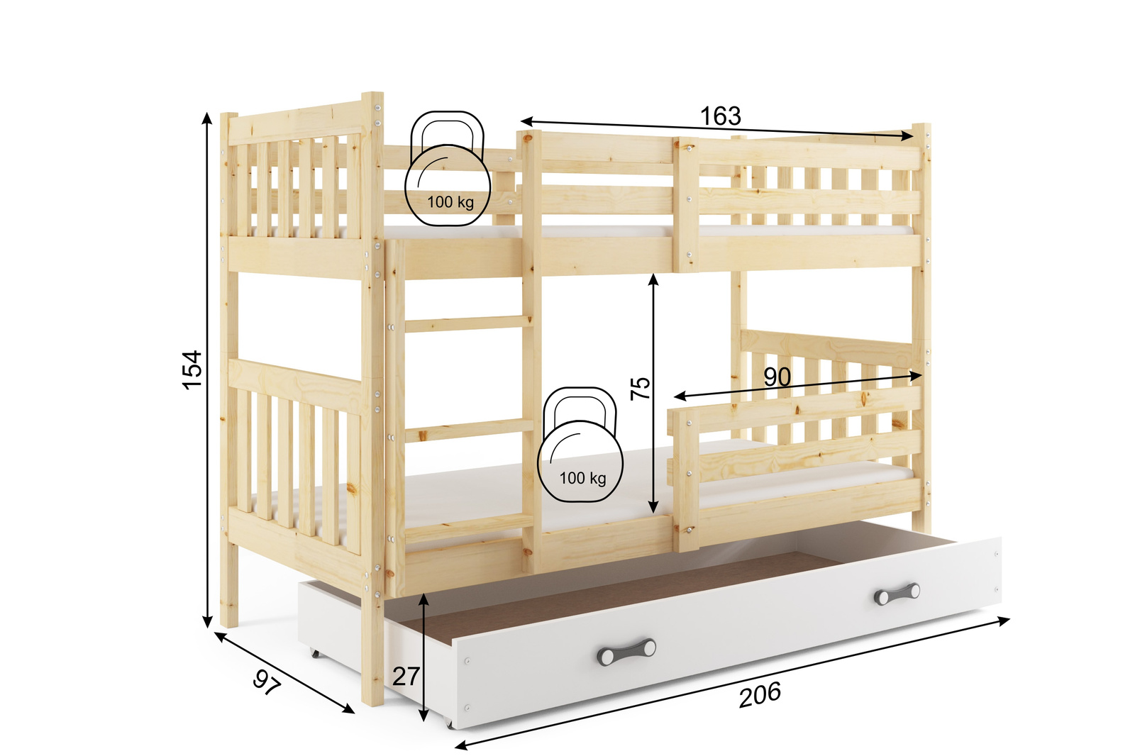 Juniorská poschodová posteľ KACPER 90X200 s matracom a zásuvkou, borovica/biela