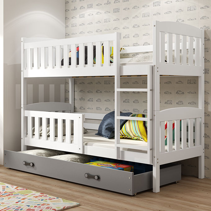 Juniorská poschodová posteľ KUBUŚ 90X200 s matracom a zásuvkou, biela/grafit