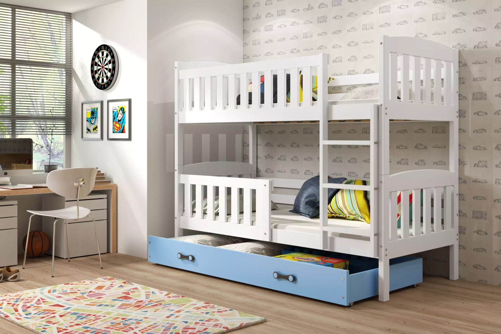 Juniorská poschodová posteľ KUBUŚ 90X200 s matracom a zásuvkou, biela/modrá
