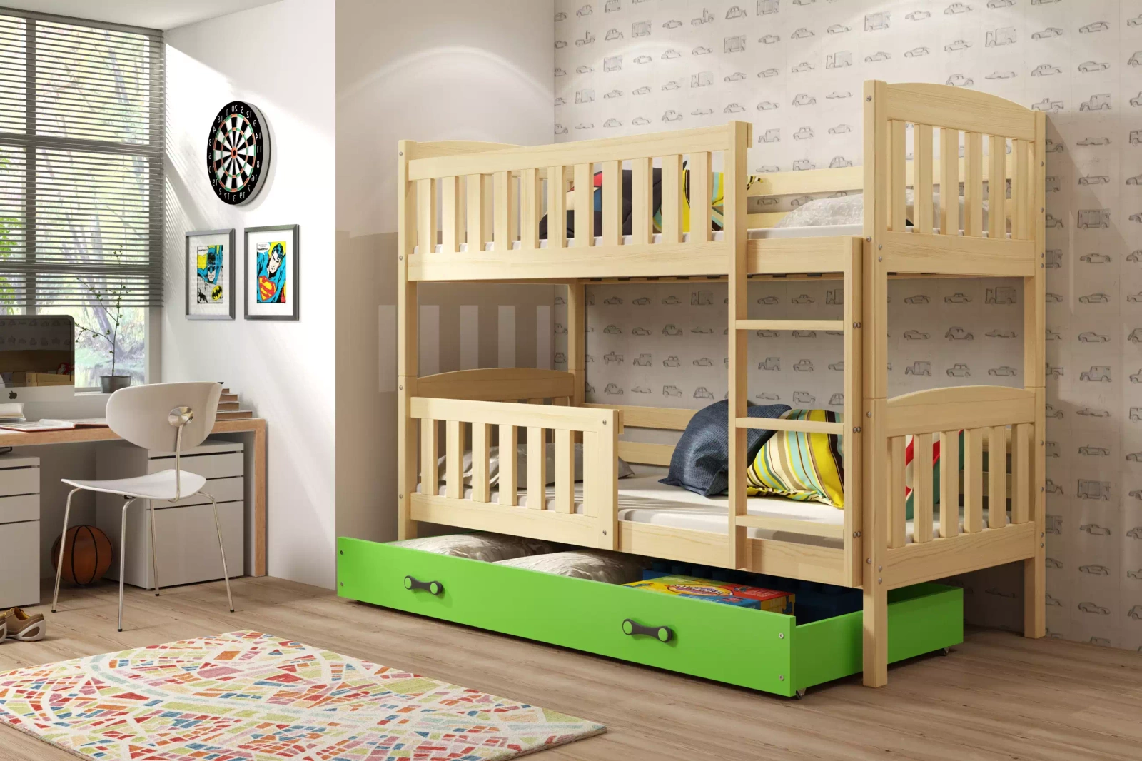 Juniorská poschodová posteľ KUBUŚ 90X200 s matracom a zásuvkou, borovicová/zelená