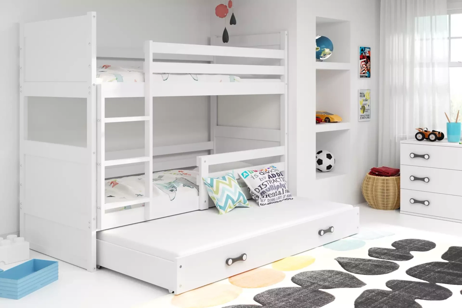 Ďalší priestor na spanie v podobe výsuvnej postele v zásuvke môže poslúžiť staršiemu dieťaťu alebo kamarátom vašich najmenších, keď zostanú cez noc. Vďaka rozmerom 90x190 je to investícia na dlhé roky - ideálna do izby trojročného dieťaťa aj tínedžera. Biela farba rámu je univerzálnym riešením, ktoré ponúka neobmedzené možnosti dizajnu. Biela farba zásuvky dokonale dopĺňa celok a vytvára ucelenú a elegantnú súpravu. Použili sme hypoalergénnu farbu, ktorá nespôsobuje alergie ani u detí s veľmi citlivou pokožkou.