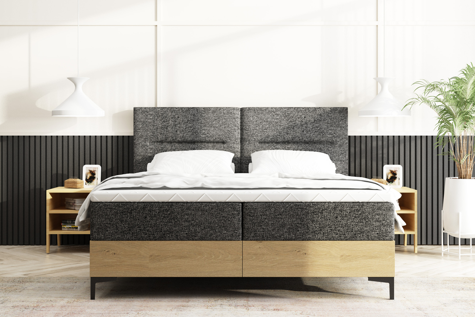 - Dva matrace z vysoko elastickej peny čalúnené látkou, ktorá zaujme moderným vzhľadom a univerzálnym štýlom. Vďaka tlmenej farbe sa dokonale hodí do svetlých aj tmavých interiérov. Je to kombinácia estetiky a odolnosti, ktorá vnesie do priestoru útulnosť a triedu.