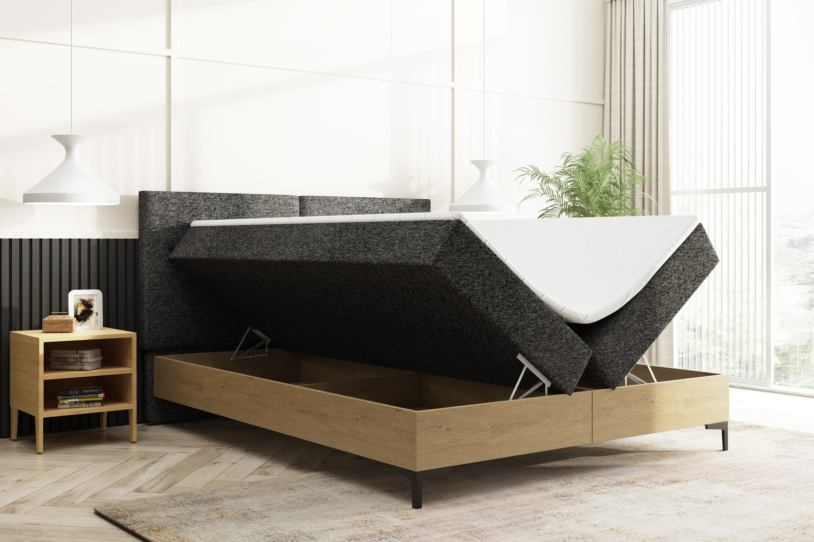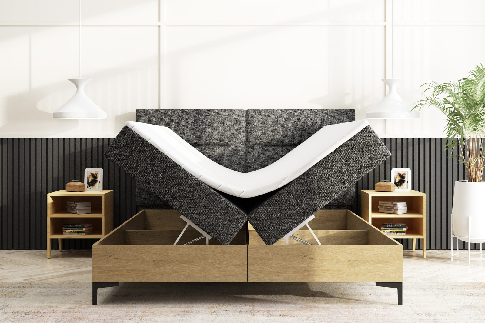 Jedným z kľúčových prvkov kontinentálnej postele 160x200 s kontajnerom je jej úložný systém. Dva koše s pružinovými zdvihákmi na jednoduché a pohodlné uloženie posteľnej bielizne alebo iného príslušenstva. Vďaka tomu je spálňa prehľadná a organizovaná.
