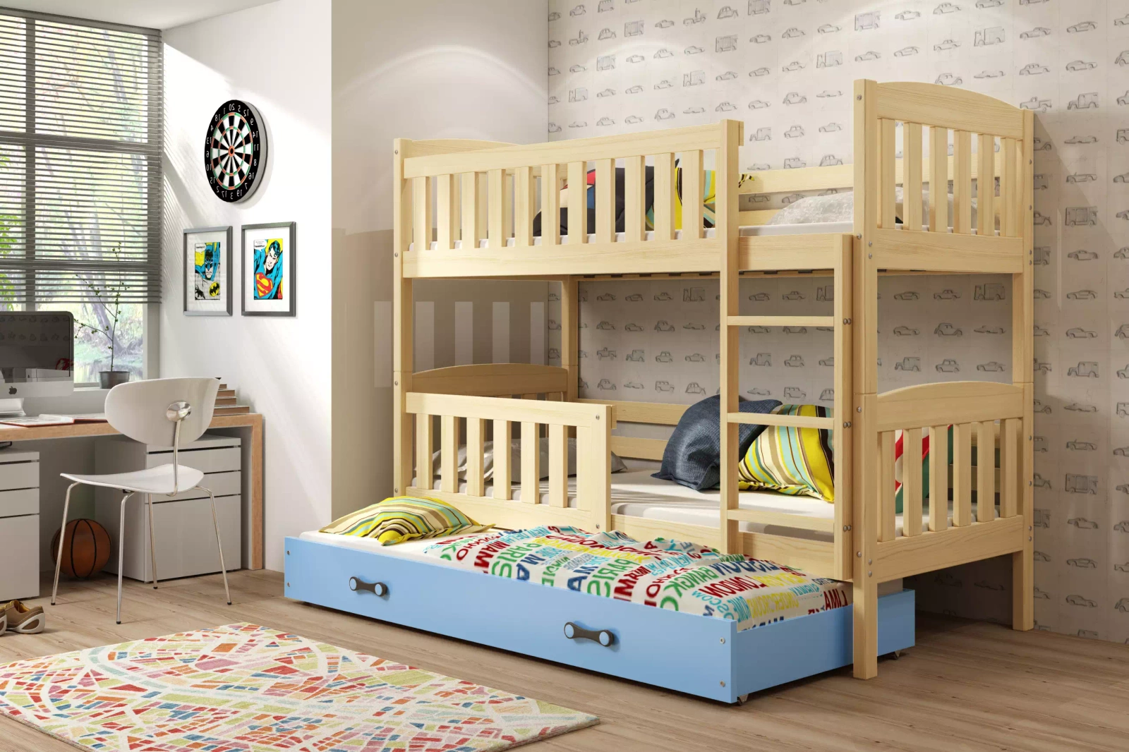 KUBUŚ 90X200 mládežnícka trojmiestna posteľ so zásuvkou, borovicová/modrá