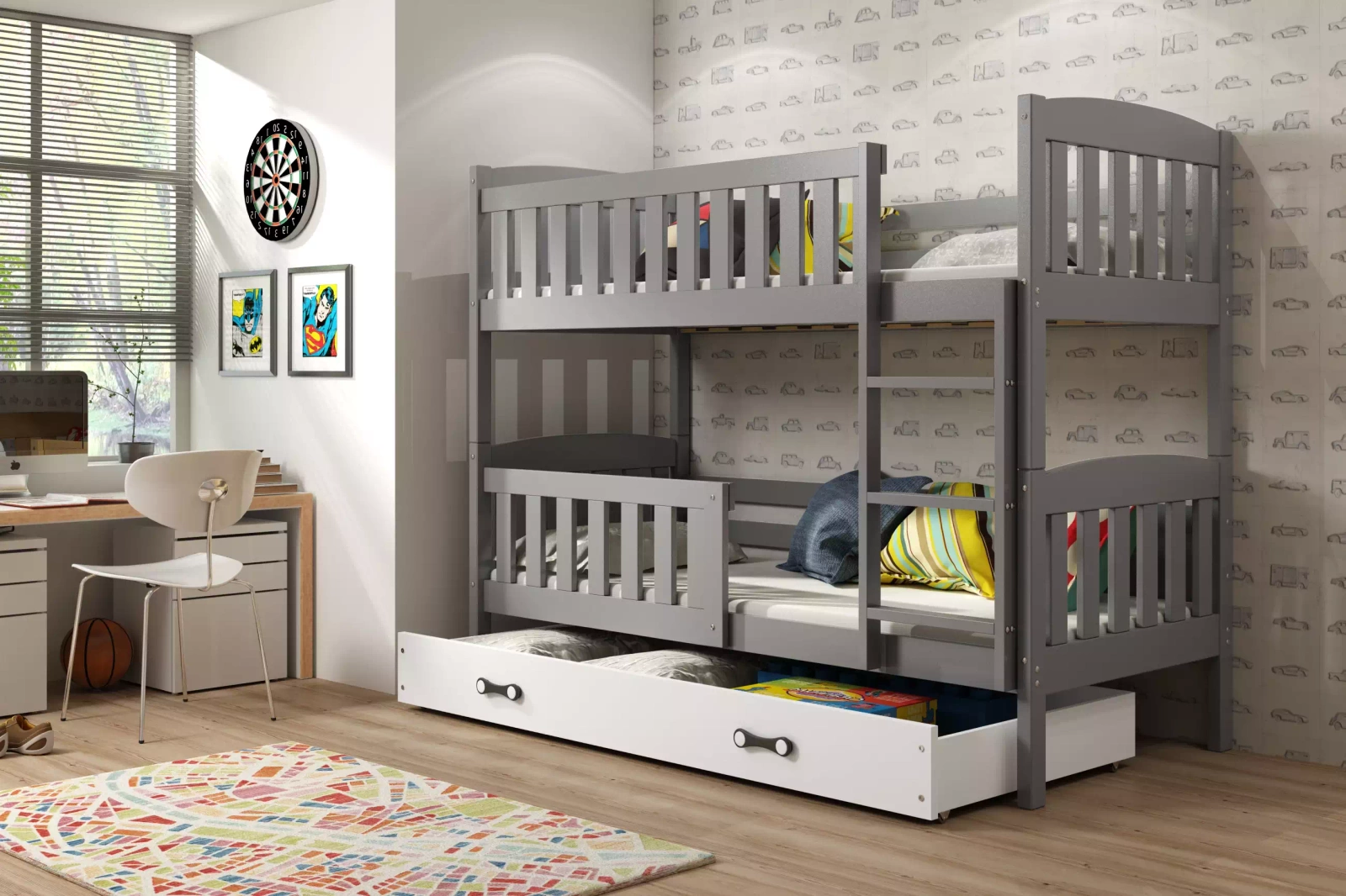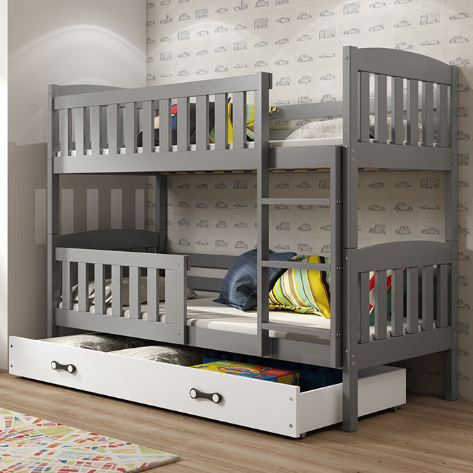 KUBUŚ 90X200 poschodová posteľ pre mladých s matracom a zásuvkou, grafitová/biela