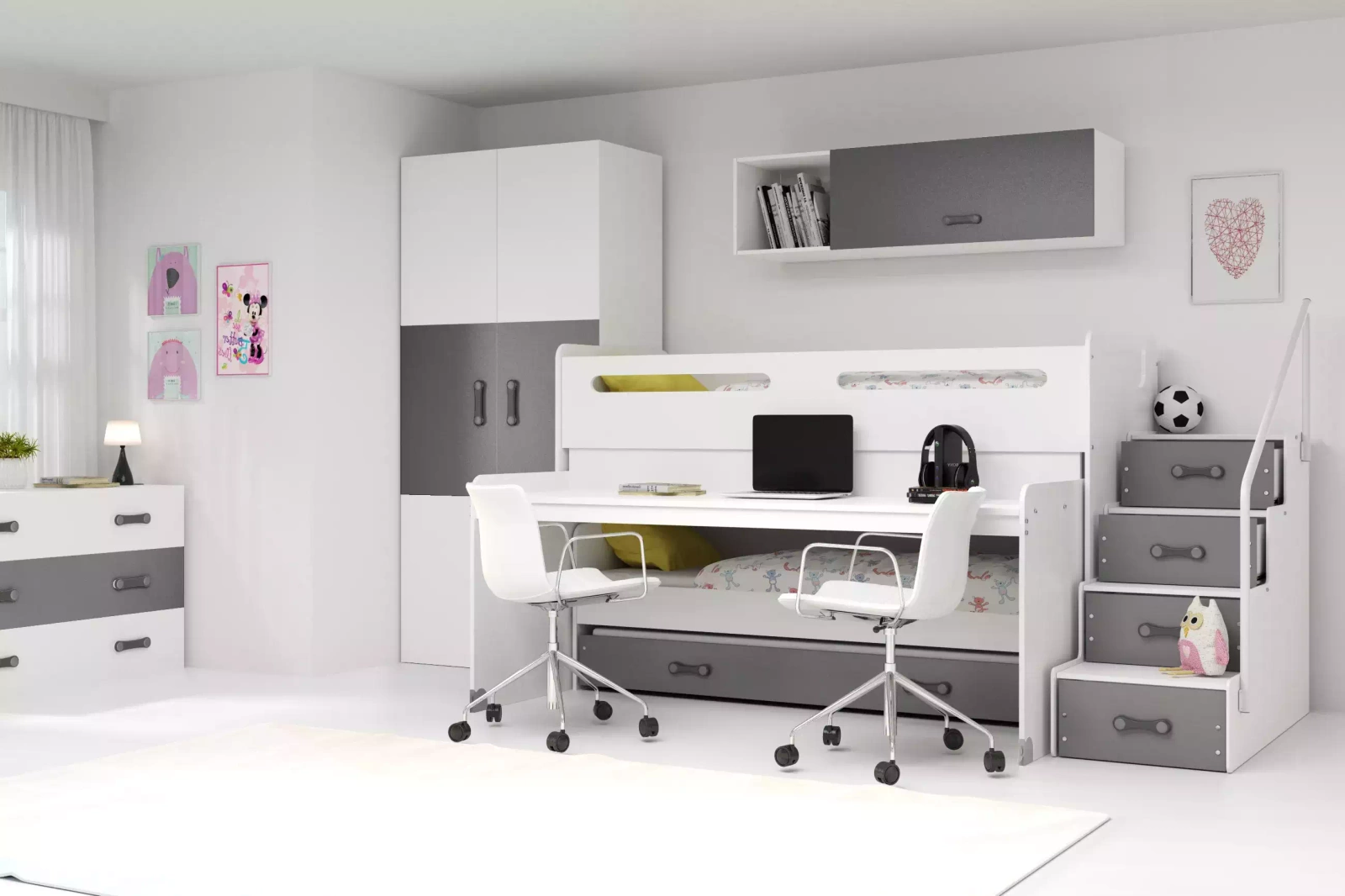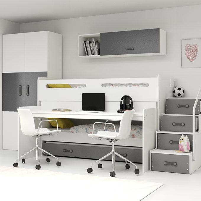 Grafitová posteľ dokonale zapadá do mladistvého štýlu. Rodičia si ich navyše obľúbia pre praktické riešenia, ako sú: ďalšie zásuvky na uloženie posteľnej bielizne alebo oblečenia a možnosť vytvoriť písací stôl a posteľ zároveň. Túto kompaktnú kombináciu ocenia najmä rodičia s viacerými deťmi, ktorí majú k dispozícii malú detskú izbu. Stupienky možno namontovať na ľavú alebo pravú stranu; ich polohu si určíte počas inštalácie.
