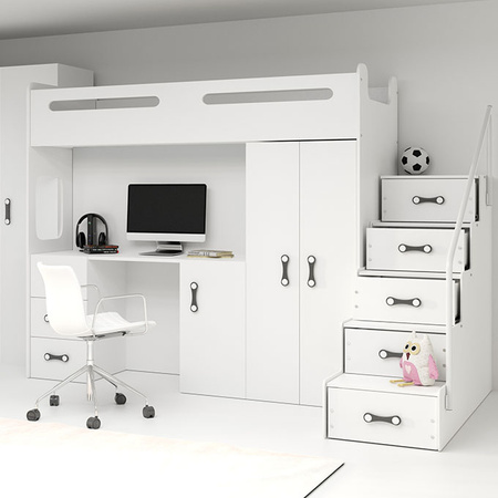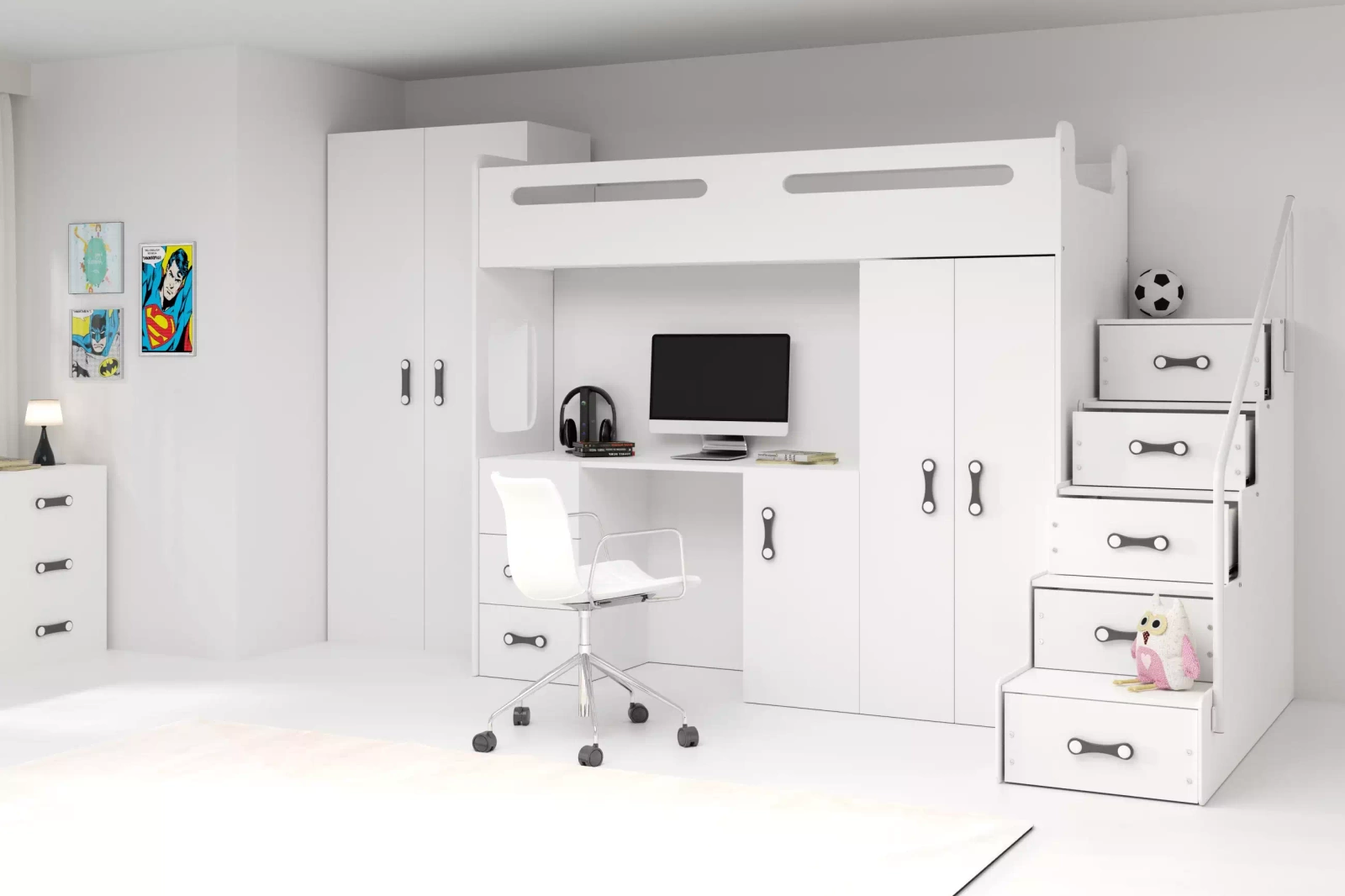 Posteľ Max 4 spĺňa všetky tieto prvky. Priestor na spanie má podobu medziposchodia, pod ktorým sa nachádza priestranný stôl a šatník, do ktorého sa zmestí všetko oblečenie vášho dieťaťa. Ďalším praktickým prvkom je schodisko, ktoré ukrýva skrinky pripravené na knihy, hračky a tiež na oblečenie, ak na ne nie je dostatok miesta v hlavnej skrini. Posteľ je zabudovaná zo všetkých strán, čo výrazne zvyšuje bezpečnosť vášho dieťaťa, najmä ak sa pohybuje aj počas spánku - a to majú všetky postele Living Srebels. Posteľ je obojstranná.
