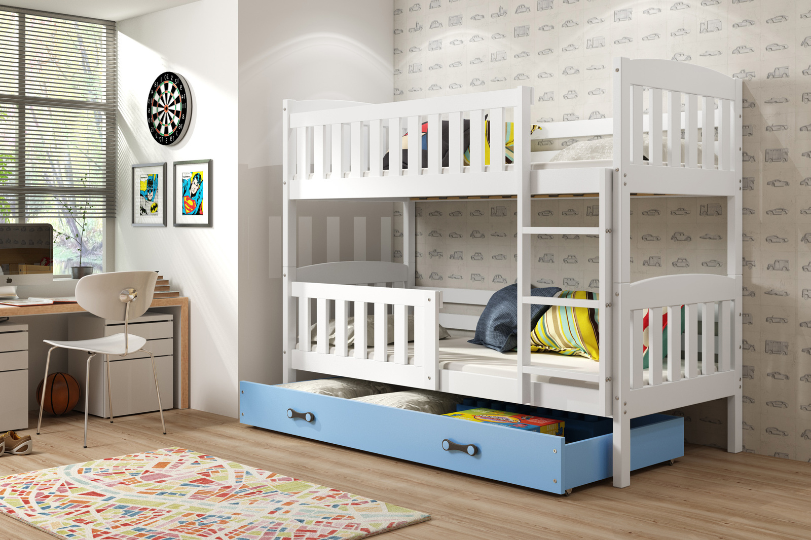 Posteľ je vybavená multifunkčnou zásuvkou na kolieskach, ktorá je ideálnym miestom na posteľnú bielizeň, hračky alebo ďalší úložný priestor na knihy. Ideálne riešenie na organizáciu priestoru a udržiavanie poriadku. Modrá zásuvka dodáva posteli chlapčenský nádych. Dizajnové rukoväte skrášľujú dizajn Zaoblený dizajn pôsobí ľahšie, takže napriek svojej veľkosti nepreťažuje interiér. Veľkosť postele 90x190 splní očakávania, keď je vekový rozdiel medzi vašimi pokladmi značný. Vďaka tomu sa stane investíciou na dlhé roky - pohodlnou pre 3-ročné aj 10-ročné dieťa.
