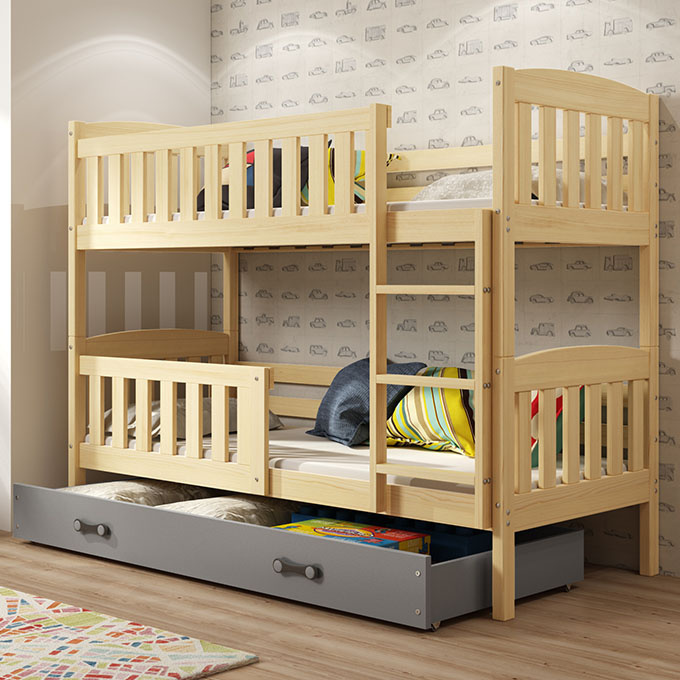 Poschodová posteľ KUBUŚ 90X200 s matracom a zásuvkou, borovica/grafit