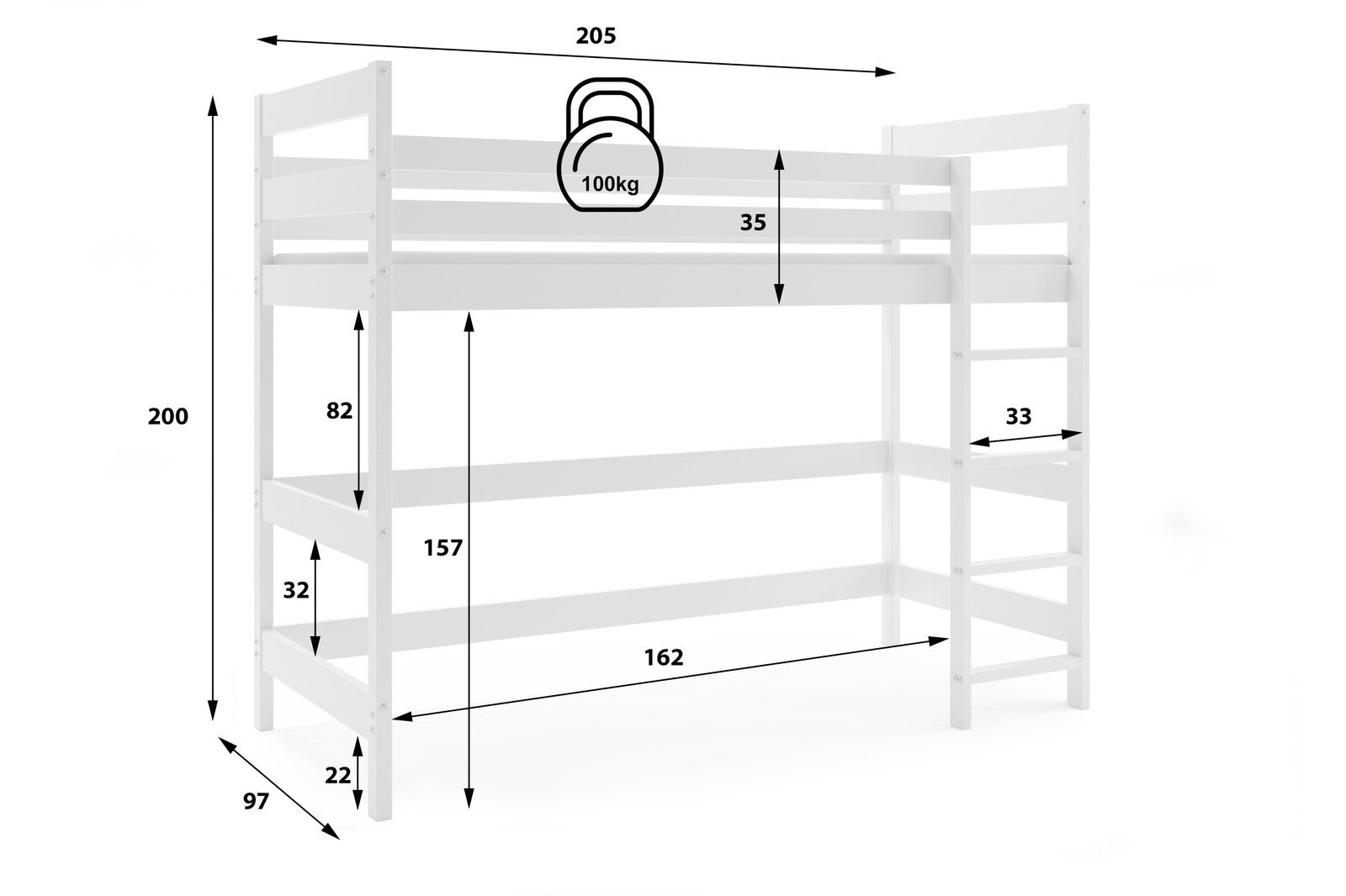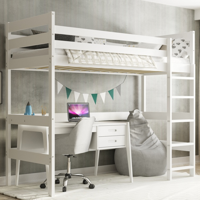 - Poschodová posteľ pre mladých s plochou na spanie 90x200 cm je ideálnym riešením pre tých, ktorí šetria miestom. Je vyrobený z dreva a vyznačuje sa bielym rámom, ktorý dokonale zapadne do interiéru každej miestnosti. Matrac nie je súčasťou balenia.