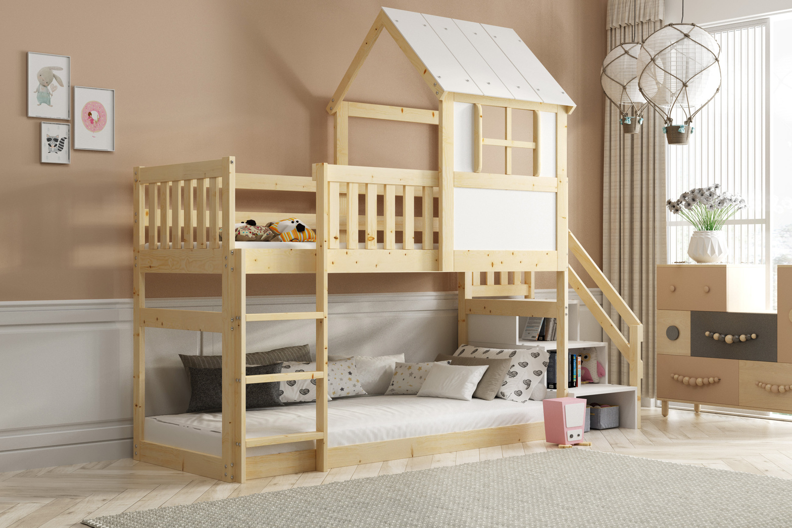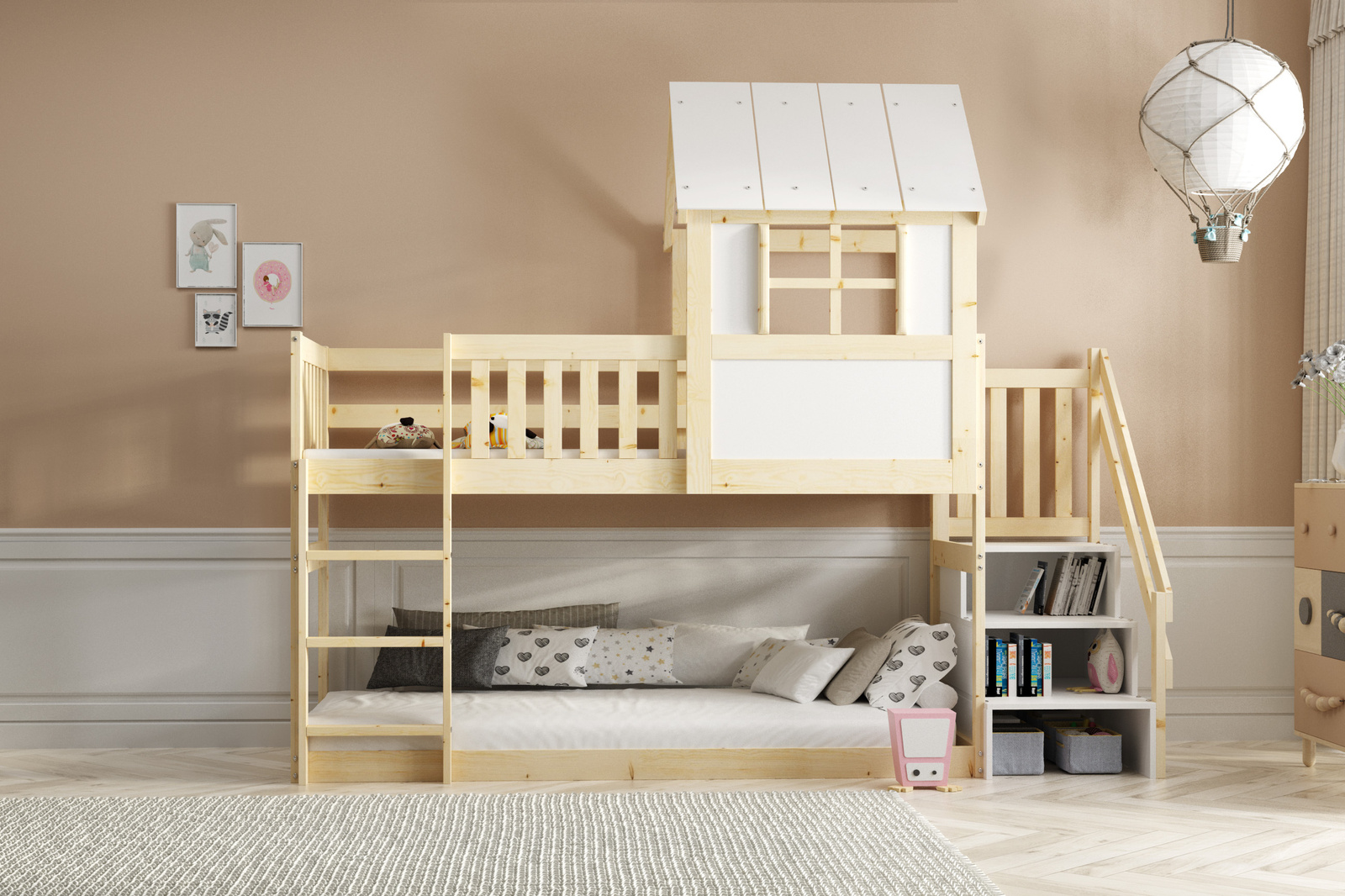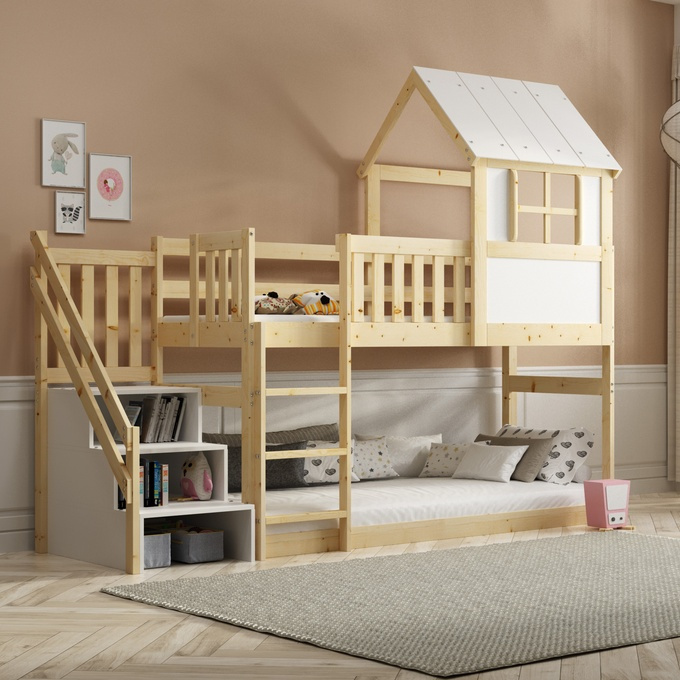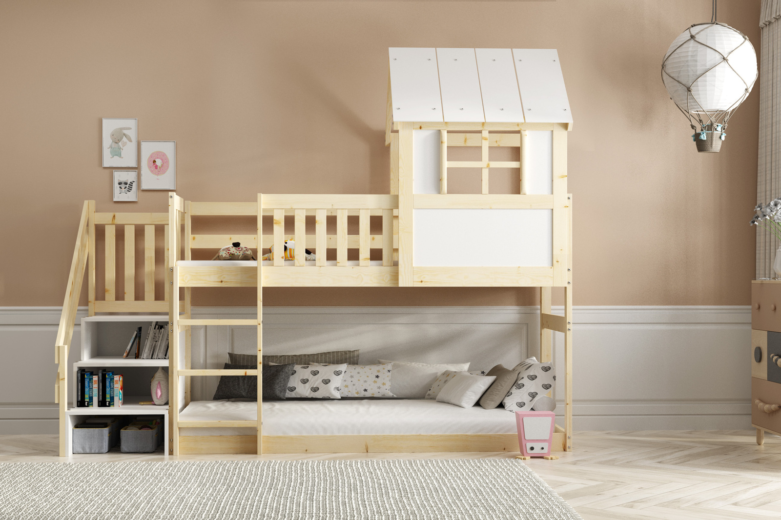 - Poschodová posteľ so schodmi je ideálnym riešením pre detskú izbu. Je vyrobený z prírodného dreva a spája funkčnosť s estetikou. Plocha na spanie 90x200 cm a biele čelá vytvárajú harmonický priestor pre vaše dieťa.