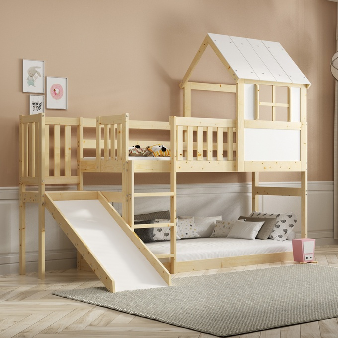 Poschodová posteľ so šmykľavkou - mezanín, domček z prírodného dreva 90x200