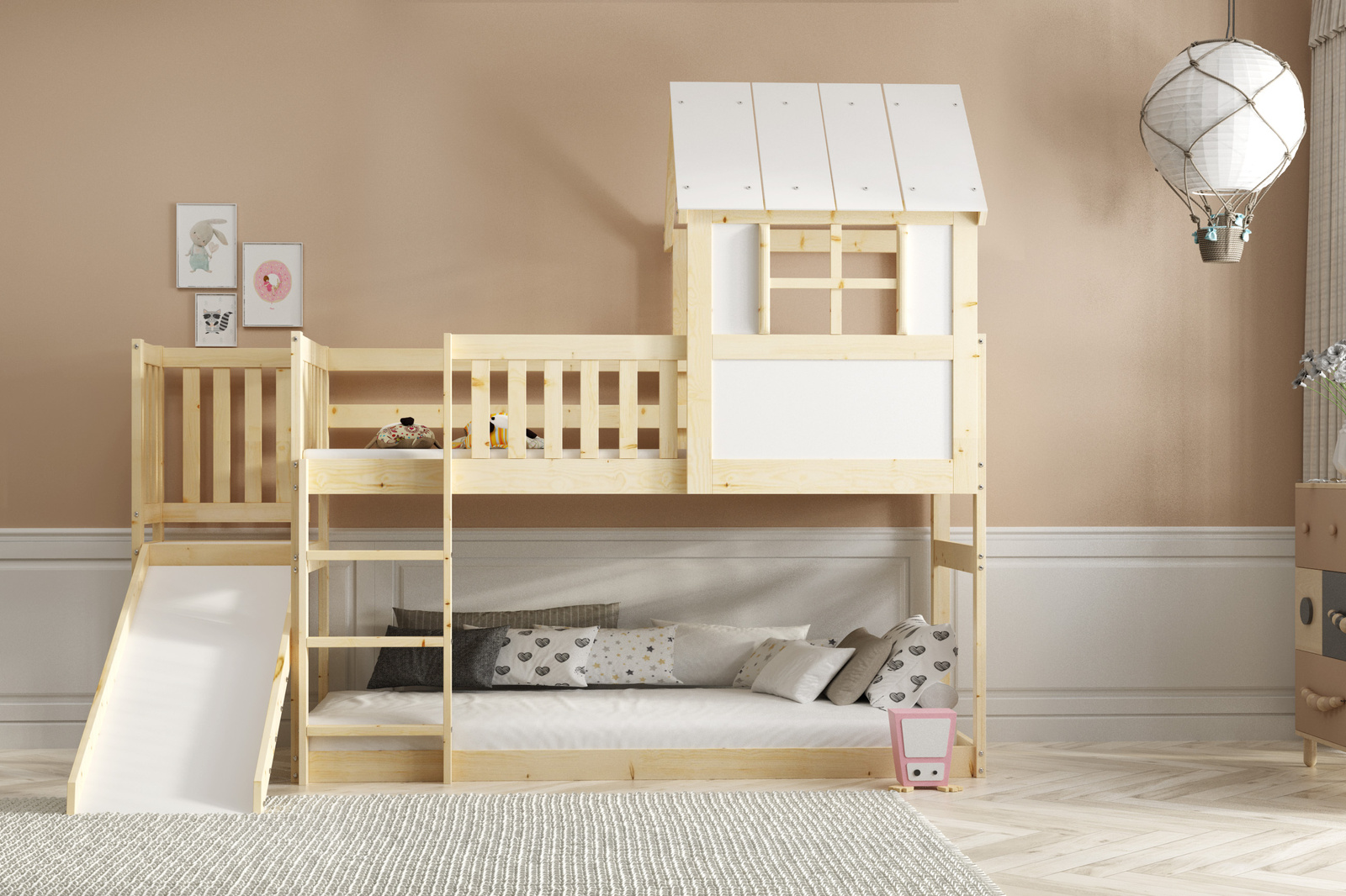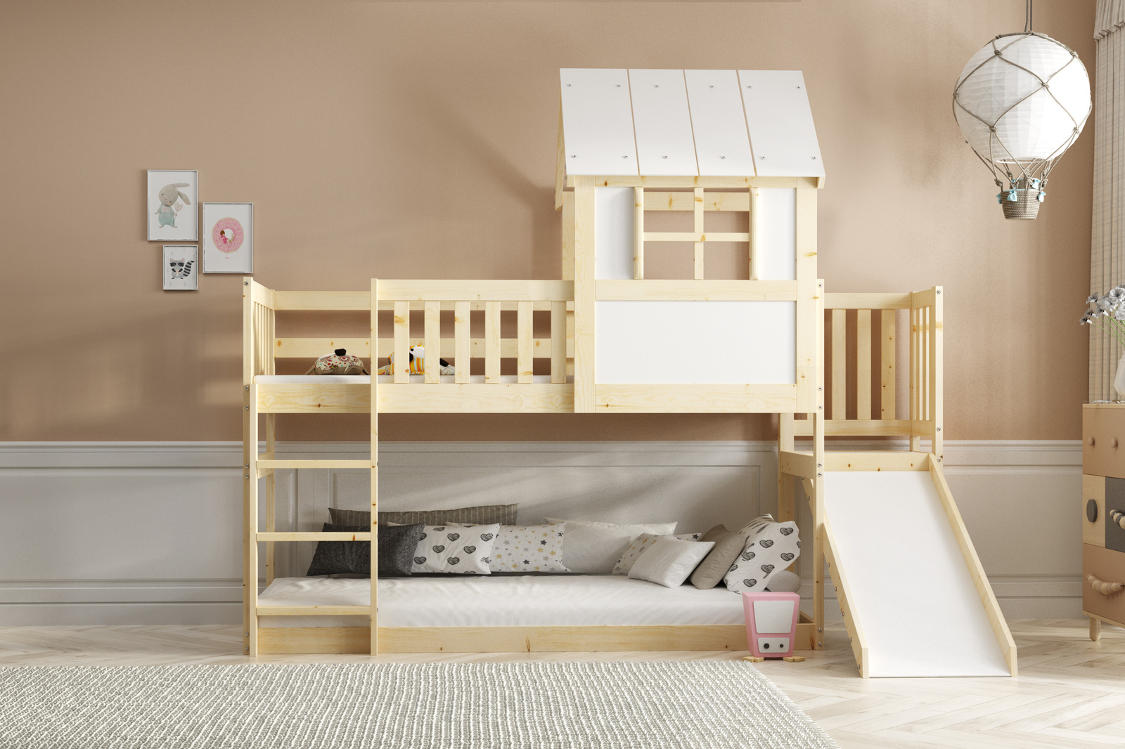 Poschodová posteľ so šmykľavkou je dokonalým riešením pre detskú izbu, ktoré spája funkčnosť so zábavou. Táto jedinečná posteľ bola navrhnutá s ohľadom na najmenších, ktorí snívajú o izbe pripomínajúcej detské ihrisko. Posteľ vyrobená z masívneho dreva sa vyznačuje prírodnou farbou rámu, ktorá vnáša do interiéru teplo a útulnosť, zatiaľ čo biela farba čiel jej dodáva moderný vzhľad.