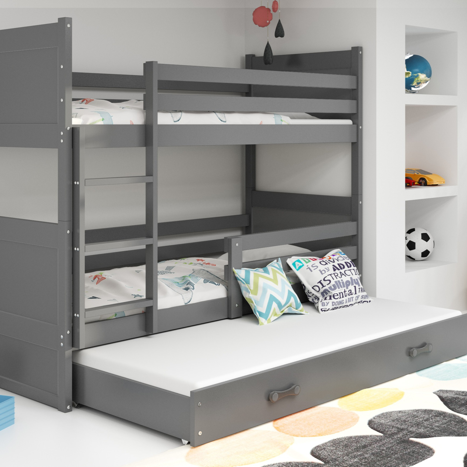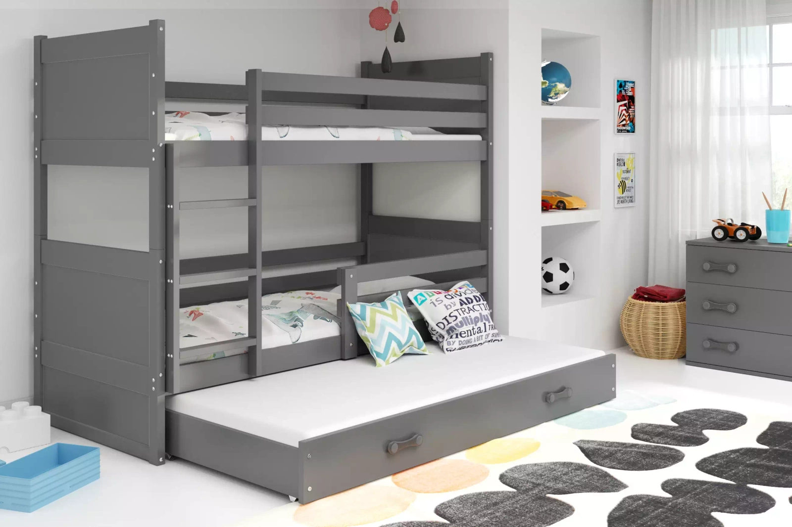 Grafitová poschodová posteľ Rico pre 3 osoby rieši problémy s umiestnením v malej spálni, takže je vynikajúcou voľbou pre malé byty s viacerými deťmi. Je vhodný aj pre všetky druhy mládežníckych centier, ktoré organizujú turistické skupiny. Vysoká nosnosť (až 100 kg na posteľ) a certifikáty TUV zaručujú, že nábytok bol vyrobený s maximálnou starostlivosťou o bezpečnosť najmenších.