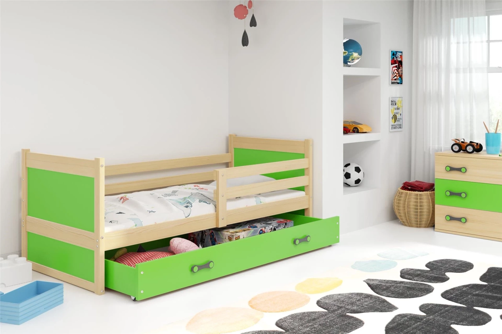 Zobrazená jednotka má veľkú zásuvku. Je ideálny na uskladnenie všetkých druhov vecí, napríklad oblečenia alebo posteľnej bielizne. Zásuvka je vybavená kolieskami, vďaka ktorým sa dá ľahko a prakticky vybrať. Všimnite si starostlivo vypracované rukoväte, ktoré robia celú vec ešte atraktívnejšou. Zelená zásuvka v spodnej časti sa dá použiť ako posteľ alebo ako ďalší úložný priestor na hračky. Praktické riešenie, ktoré si obľúbite predovšetkým vtedy, ak máte radi poriadok. Do tejto postieľky si môžete zakúpiť matrac s klimatizačným vláknom. Samotný poťah je vyrobený z hypoalergénnej tkaniny, takže je vhodným riešením pre deti trpiace alergiami.