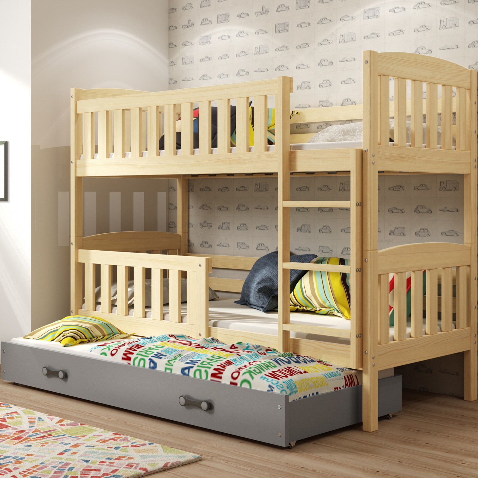 Trojmiestna posteľ Kubuś bola vytvorená s ohľadom na väčšie rodiny. Umožní vám prispôsobiť jednu izbu aj pre tri vaše deti. V oboch salónikoch je možné nainštalovať zábrany, ktoré chránia zaneprázdnené batoľatá pred pádom, čím sa zabezpečí ich pohodlie a váš pokoj. Tretie lôžko na spanie je dômyselne ukryté v zásuvke pod posteľou z odolnej drevotrieskovej dosky. Môže slúžiť ako miesto každodenného odpočinku pre iné staršie dieťa alebo príležitostne pre kamarátov vašich detí, ktorí sa rozhodnú prenocovať. Konštrukcia je vyrobená z robustného borovicového dreva a vystužená oceľovými skrutkami, ktoré zároveň pôsobia ako zaujímavý dekoratívny prvok. Rebrík je možné namontovať na pravú alebo ľavú stranu. Rám z pružinových brezových lamiel poskytuje pohodlnú a stabilnú oporu pre chrbticu a zlepšuje kvalitu spánku. Prírodné drevo zohreje každú miestnosť.
