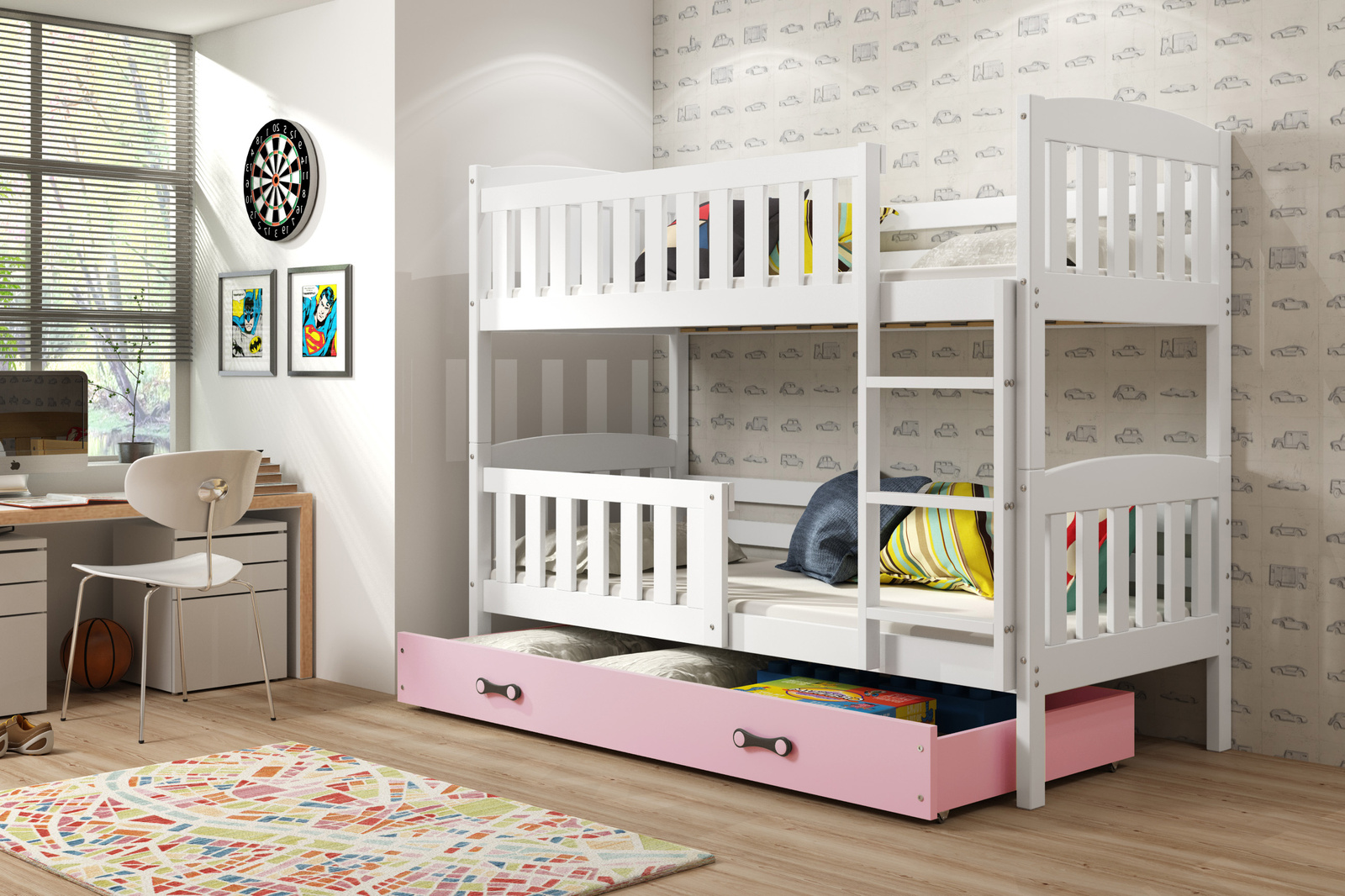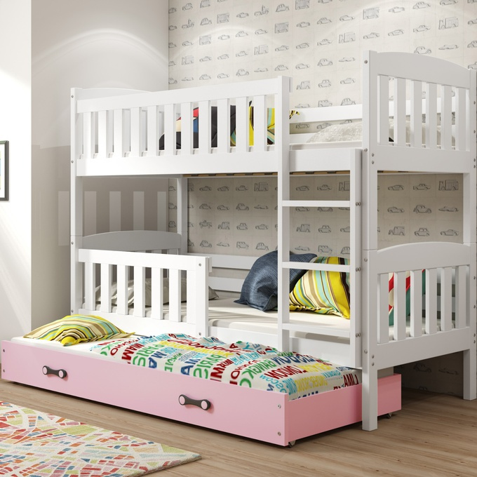 Trojmiestna posteľ pre mladých KUBUŚ 90X200 so zásuvkou, biela/ružová