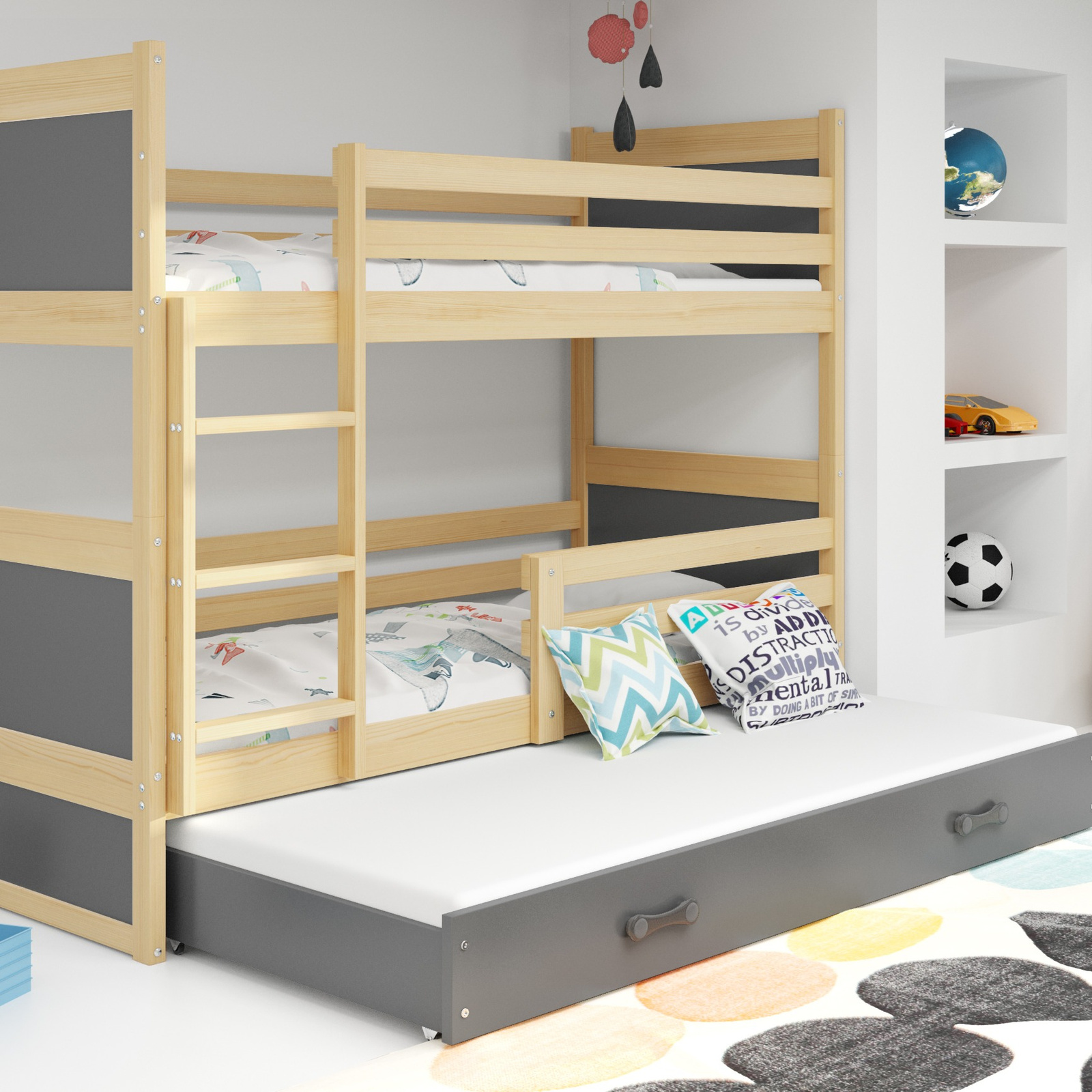 Ak potrebujete zariadiť malú izbu pre svoje deti, toto je riešenie pre vás. Pohodlná a pohodlná posteľ zaistí v noci bezpečnosť až trom deťom a zaručí vám pokojný spánok. Rám z borovicového dreva je pevný a stabilitu konštrukcie zvyšujú vysokokvalitné skrutky na vysoké namáhanie. Vďaka tomu posteľ vydrží viac ako jednu vankúšovú bitku. Ochranné zábrany na spodnej a hornej úrovni zvyšujú bezpečnosť, takže obe miesta sú vhodné aj pre najmenšie batoľatá - vrátane tých, ktoré sa neprestanú hrbiť ani v spánku. Naše postele sú všestranné. O polohe rebríka rozhodujete počas inštalácie. Môže byť vľavo alebo vpravo. Ďalší priestor na spanie vo forme výsuvnej zásuvky môžete poskytnúť staršiemu dieťaťu alebo kamarátom vašich detí, keď sa objavia na celonočnom stretnutí. Prírodné drevo zútulní každú miestnosť a poskytne množstvo dizajnových možností. Grafitová farba zásuvky je zaujímavým akcentom. Posteľ sa stáva stredobodom aranžmánu.