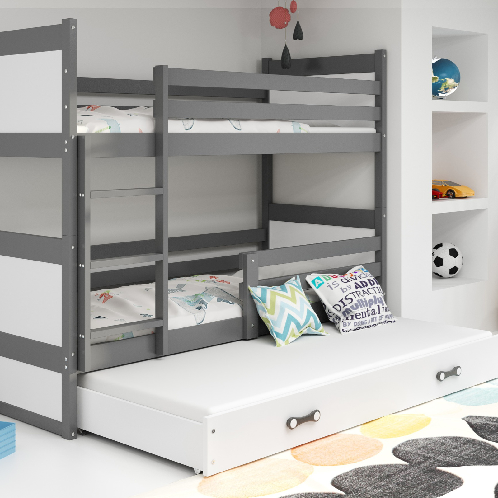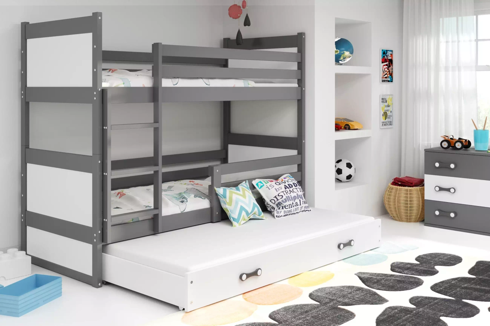 Rico je trojmiestna posteľ pozostávajúca z dvoch poschodí a výsuvnej zásuvky ako ďalšieho priestoru na spanie. Tento kvalitný nábytok vyrobený z odolného dreveného rámu a vybavený brezovými pružinovými pásmi bude vašim deťom dlho slúžiť.