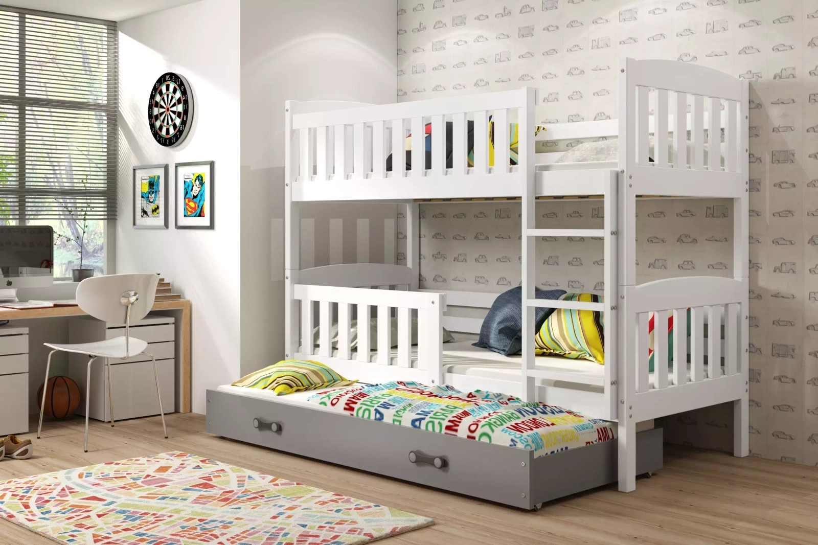 Trojposteľ KUBUŚ 90X190 so zásuvkou, biela/grafit