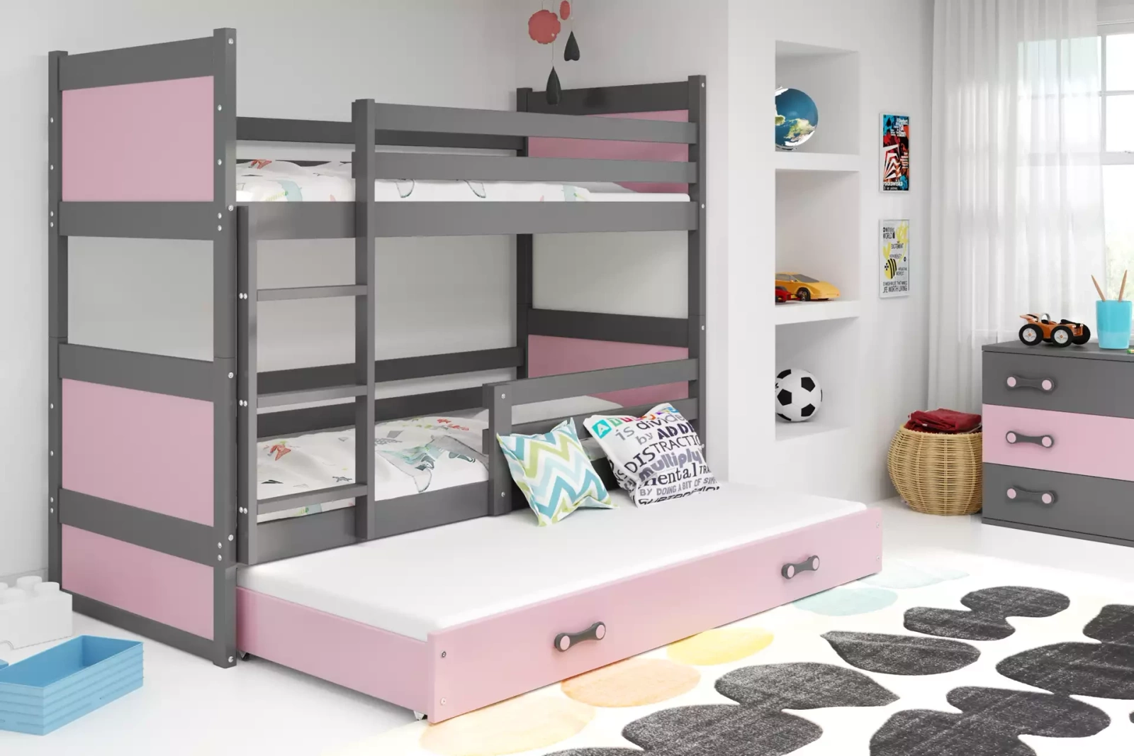 Trojposteľ RICO 90X190 pre mladých s matracom a zásuvkou, grafitová/ružová