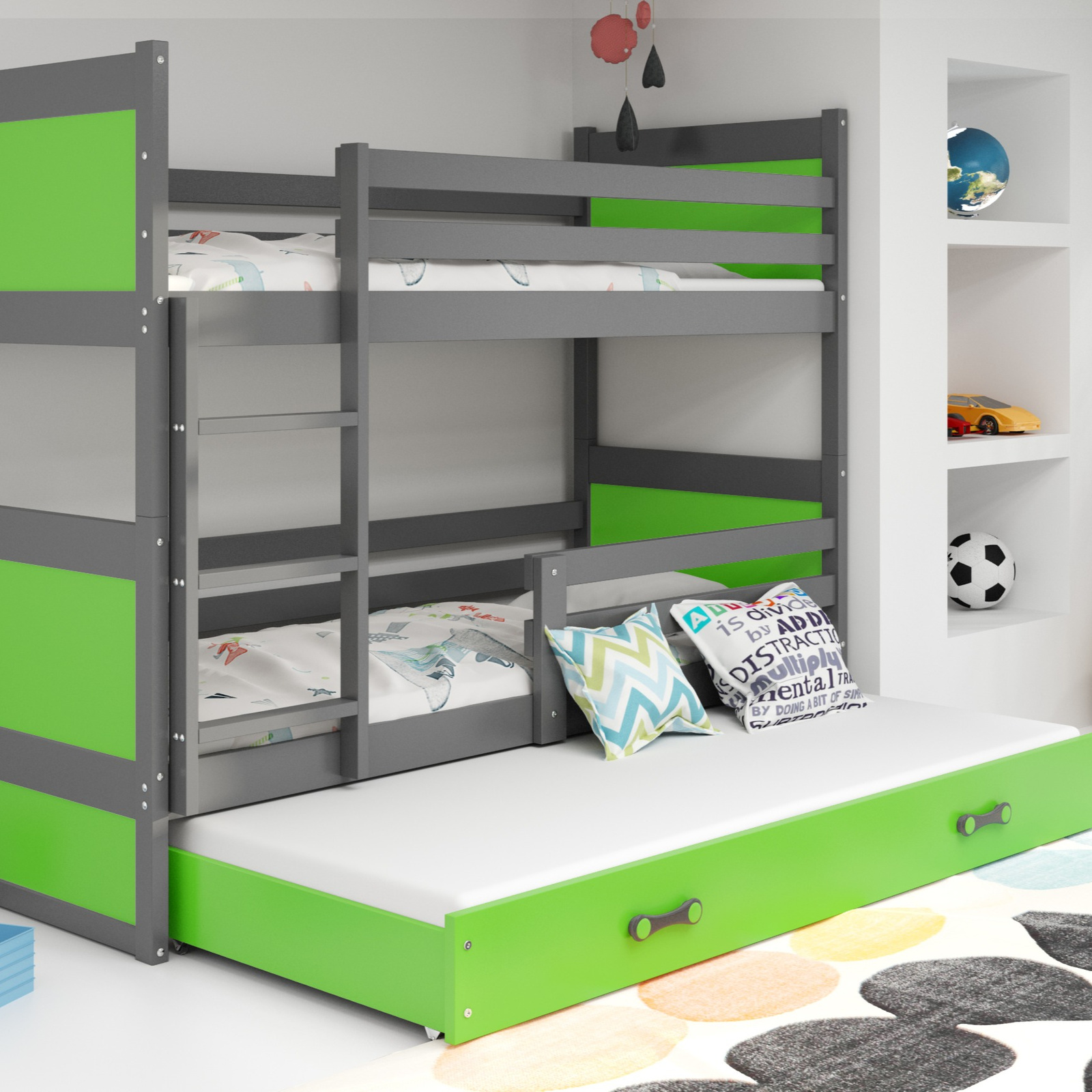 Trojposteľ RICO 90X200 pre mladých s matracom a zásuvkou, grafitová/zelená