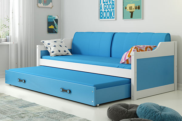 Výsuvná posteľ pre mladých DAWID 90X200 s matracom a zásuvkou, biela/modrá