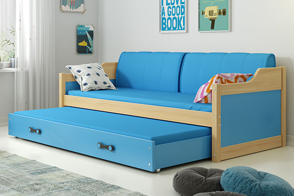 Výsuvná posteľ pre mladých DAWID 90X200 s matracom a zásuvkou, borovicová/modrá