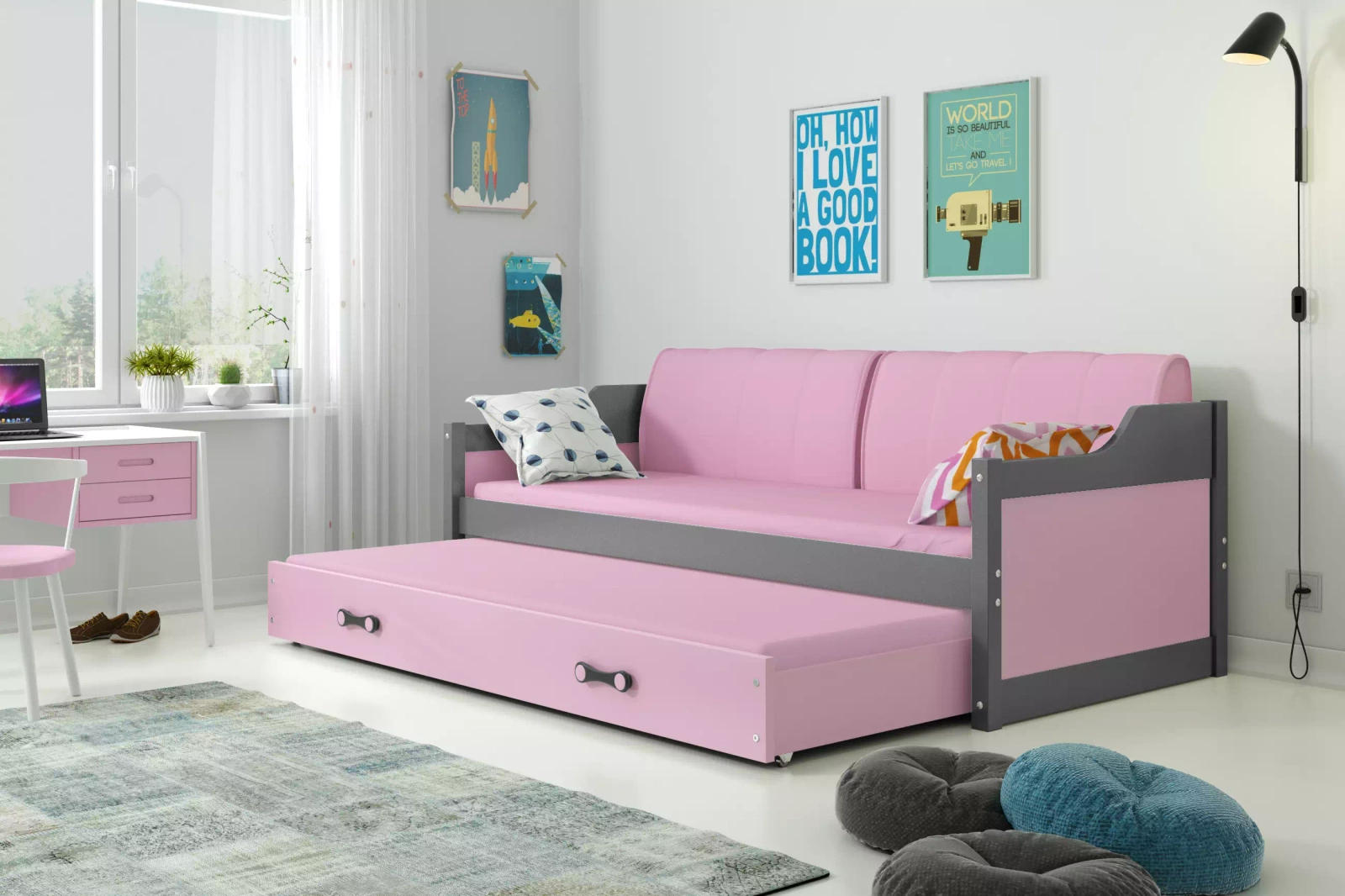 David je rozkladacia posteľ v ružovej a grafitovej farbe, ktorá sa určite bude páčiť dievčatám. Táto rozkladacia posteľ pre 2 osoby vybavená dvoma matracmi má plochu na spanie 90x200 cm v hornej časti a 80x190 cm v dolnej časti. Matrac, ktorý je umiestnený vo výsuvnej zásuvke, sa dá v noci ľahko vytiahnuť a cez deň odložiť, takže deti majú viac priestoru na hranie.