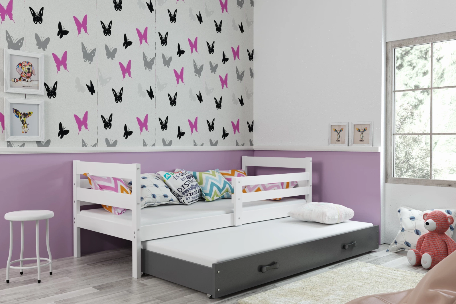 Posteľ pre mladých Erik sa vyznačuje univerzálnym charakterom, takže ju možno umiestniť do chlapčenských aj dievčenských izieb. Veľká úžitková plocha znamená, že nábytok poslúži deťom všetkých vekových kategórií, a preto je výbornou investíciou na niekoľko rokov. Posteľ pre mladých so zásuvkou je tiež veľmi funkčný kus nábytku. Je to vďaka širokým možnostiam využitia ako manželskej postele pre mladých aj ako úložného priestoru na najrôznejšie veci, oblečenie a posteľnú bielizeň. Nosnosť každej úrovne je až 100 kg, čo znamená pevnosť a odolnosť. Posteľ pre mladých je k dispozícii aj v iných farebných verziách. K dispozícii je biely a grafitový odtieň rámu a prírodná farba borovice. Okrem toho je možné zladiť farbu zásuvky. Zábranu je možné namontovať vpravo alebo vľavo, výber vykonáte počas montáže.