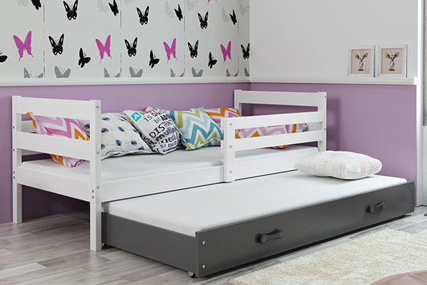 Posteľ pre mladých Erik sa vyznačuje univerzálnym charakterom, takže ju možno umiestniť do chlapčenských aj dievčenských izieb. Veľká úžitková plocha znamená, že nábytok poslúži deťom všetkých vekových kategórií, a preto je výbornou investíciou na niekoľko rokov. Posteľ pre mladých so zásuvkou je tiež veľmi funkčný kus nábytku. Je to vďaka širokým možnostiam využitia ako manželskej postele pre mladých aj ako úložného priestoru na najrôznejšie veci, oblečenie a posteľnú bielizeň. Nosnosť každej úrovne je až 100 kg, čo znamená pevnosť a odolnosť. Posteľ pre mladých je k dispozícii aj v iných farebných verziách. K dispozícii je biely a grafitový odtieň rámu a prírodná farba borovice. Okrem toho je možné zladiť farbu zásuvky. Zábranu je možné namontovať vpravo alebo vľavo, výber vykonáte počas montáže.