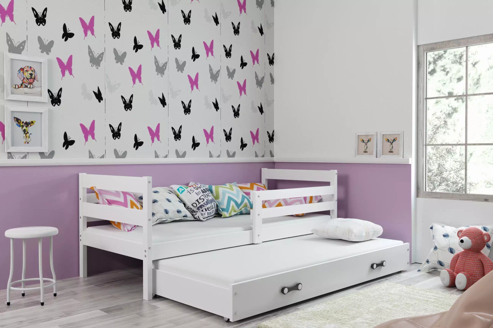 Posteľ pre mladých Erik sa vyznačuje univerzálnym charakterom, takže ju možno umiestniť do chlapčenských aj dievčenských izieb. Veľká úžitková plocha znamená, že nábytok poslúži deťom všetkých vekových kategórií, a preto je výbornou investíciou na niekoľko rokov. Posteľ pre mladých so zásuvkou je tiež veľmi funkčný kus nábytku. Je to vďaka širokým možnostiam využitia ako manželskej postele pre mladých aj ako úložného priestoru na najrôznejšie veci, oblečenie a posteľnú bielizeň. Nosnosť každej úrovne je až 100 kg, čo znamená pevnosť a odolnosť. Posteľ pre mladých je k dispozícii aj v iných farebných verziách. K dispozícii je biely a grafitový odtieň rámu a prírodná farba borovice. Okrem toho je možné zladiť farbu zásuvky. Zábranu je možné namontovať vpravo alebo vľavo, výber vykonáte počas montáže.